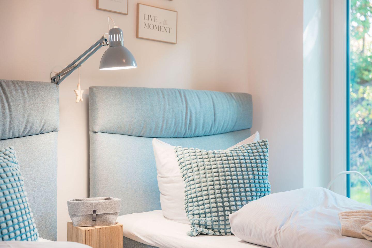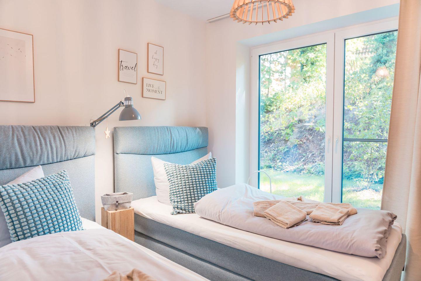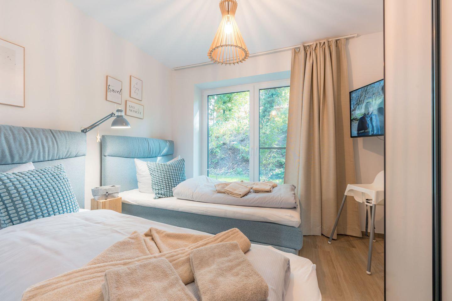 Schlafzimmer 2: 2 Einzelbetten (Boxspringbett 100 x 200 cm) , Flat-TV ebenfalls mit Unterstützung von Streamingdiensten über Apps oder eigene Geräte, Leselampen, Kleiderschrank, Verdunklungsgardinen, Bettwäsche auf Anfrage