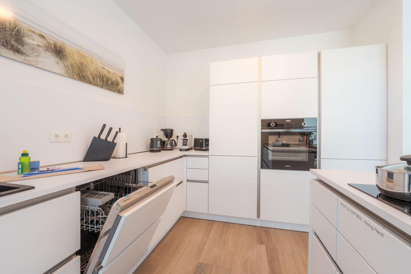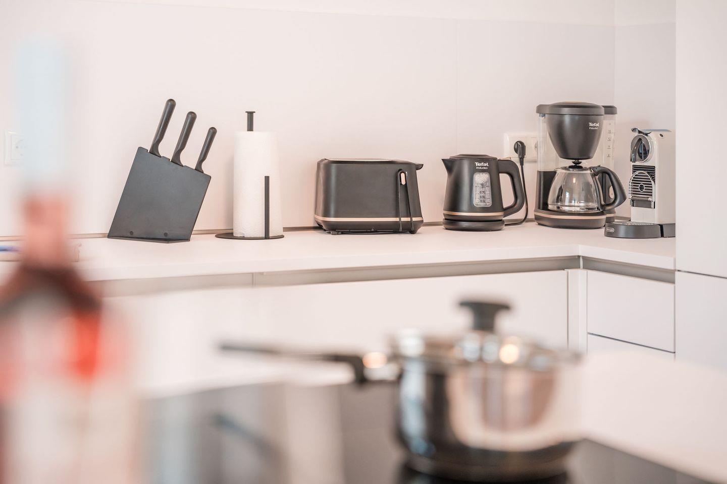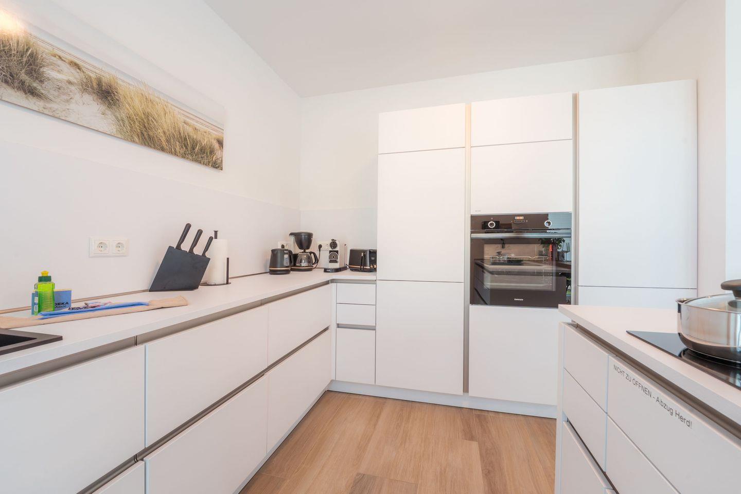 Küche und Haushalt: Einbauküche, Kühlschrank mit kombinierten Gefrierfächern (2 Stück), 4-Zonen Cerankochfeld mit integriertem Abzug, Mikrowelle, Backofen, Geschirrspüler, Toaster, Eierkocher, Wasserkocher, Kaffeefiltermaschine (Filtergröße 4), Kaffeemaschine Nespresso, hochwertiges Geschirr und Besteck