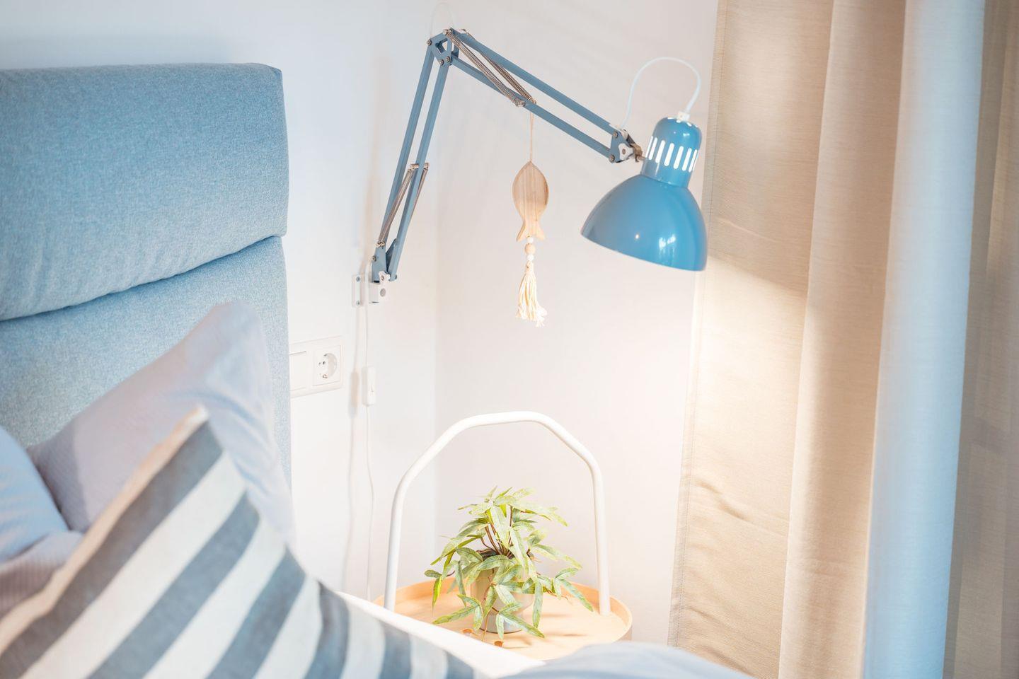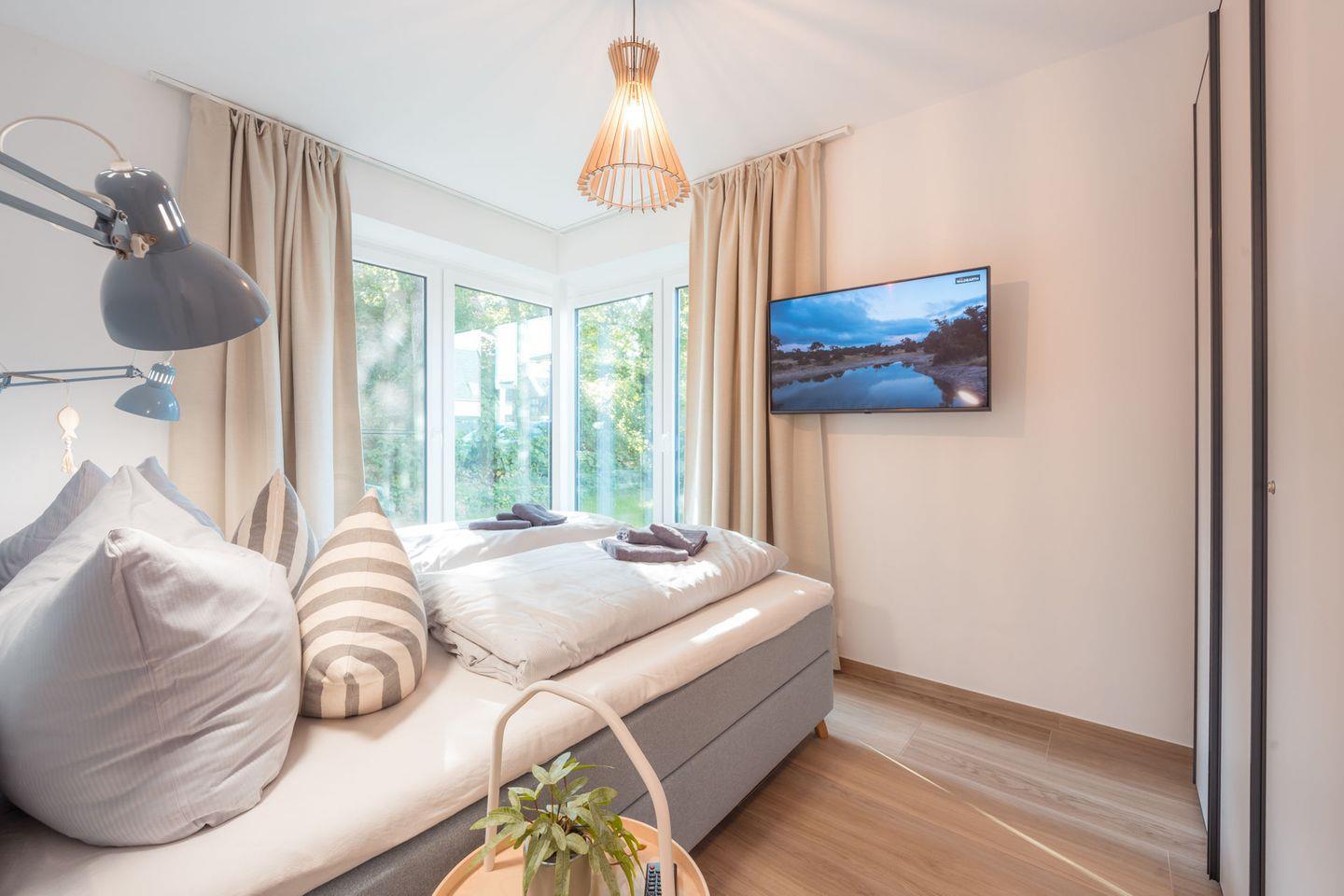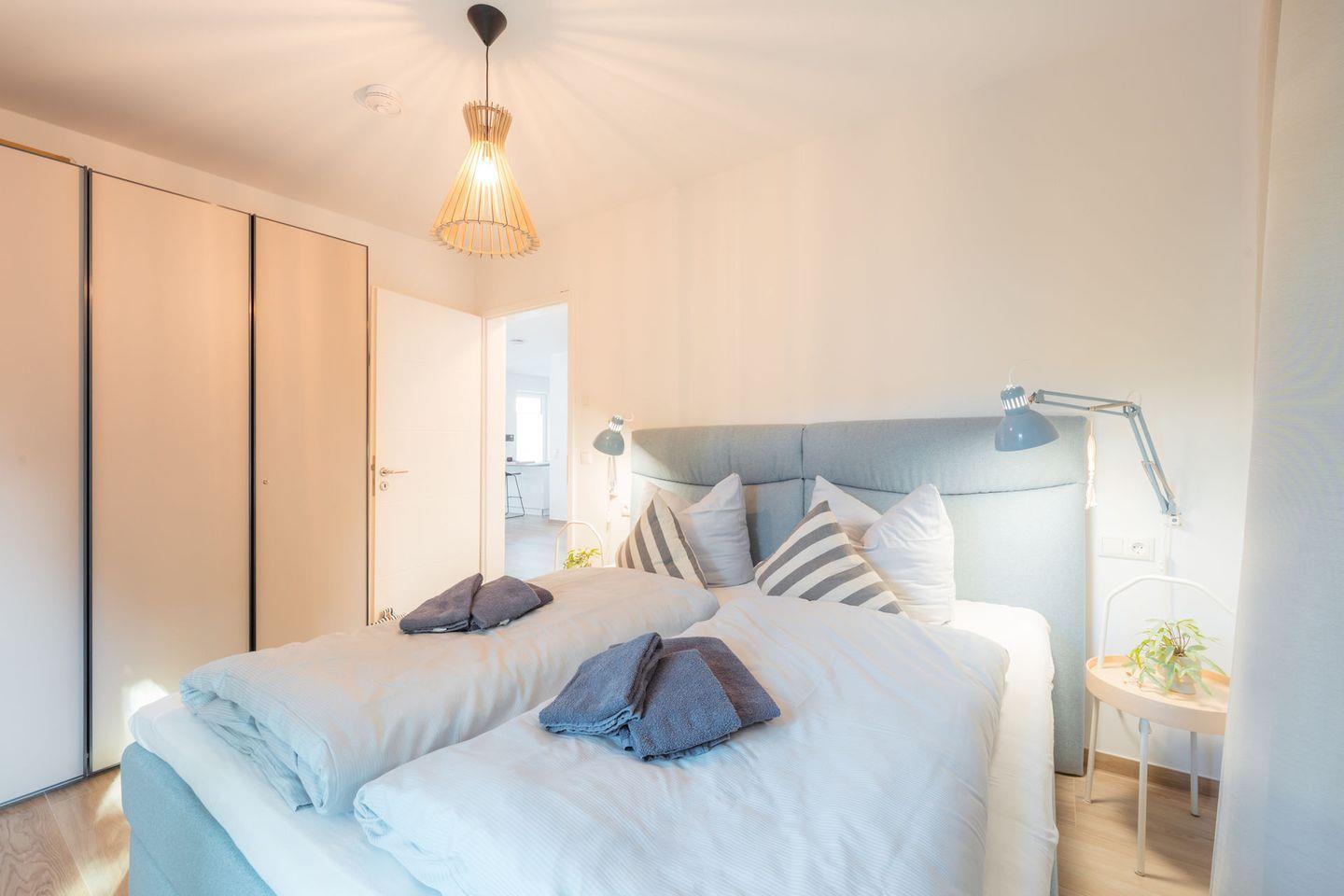 Schlafzimmer 1: Doppelbett (Boxspringbett mit einer Matratze 180x200 cm), Leselampen, Kleiderschrank, Verdunklungsgardinen, Bettwäsche auf Anfrage