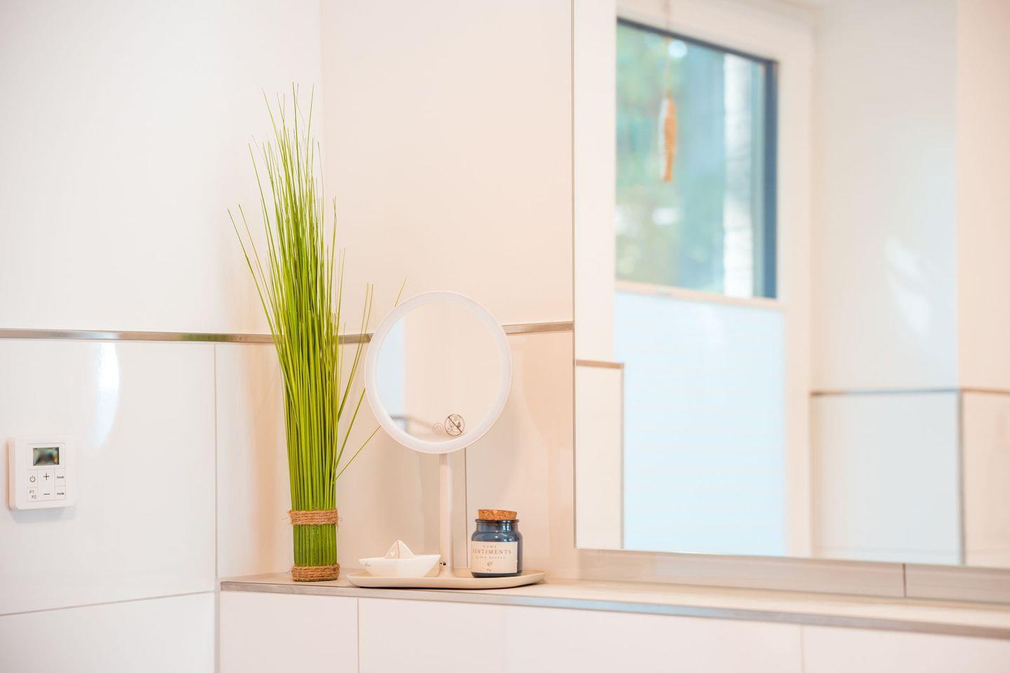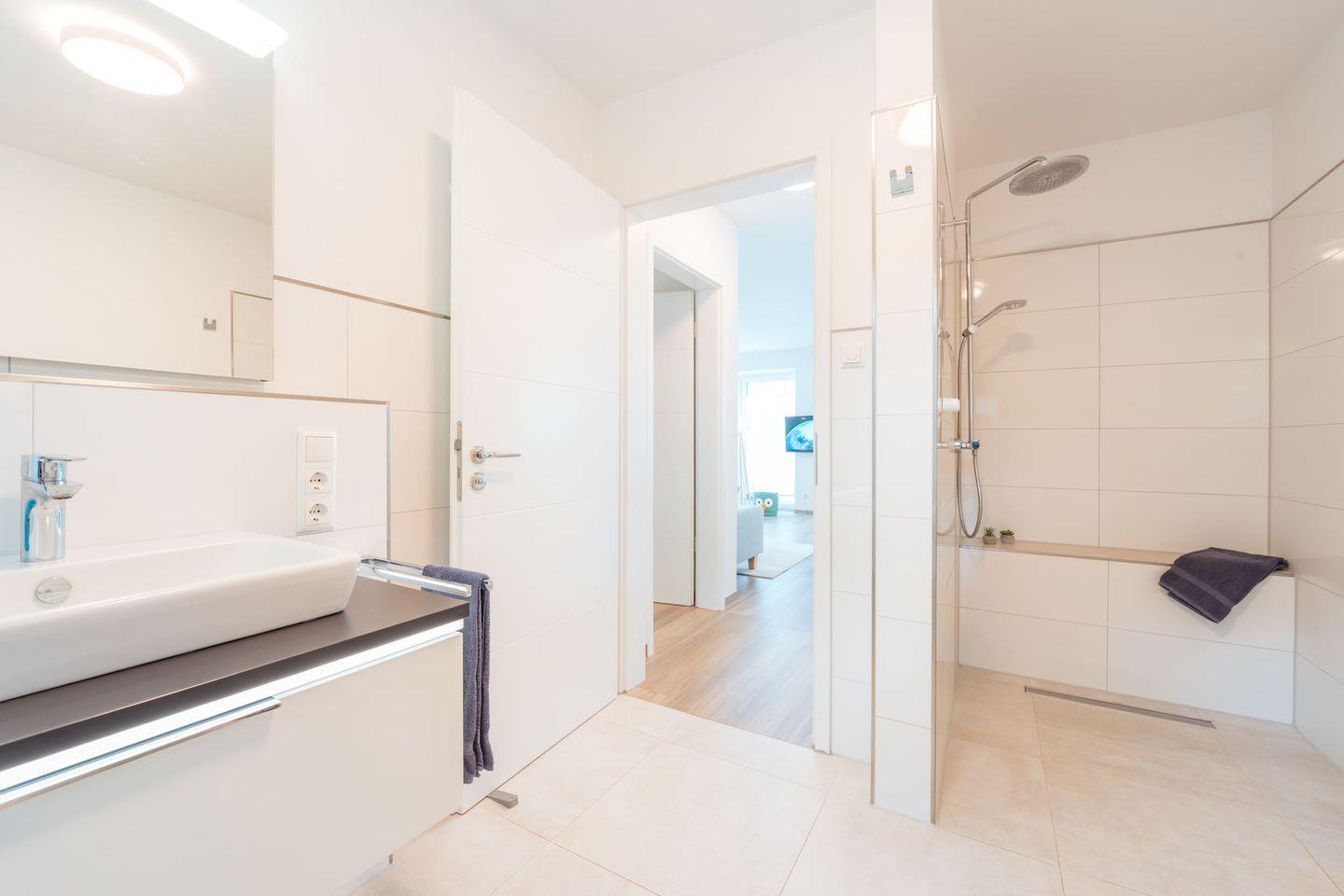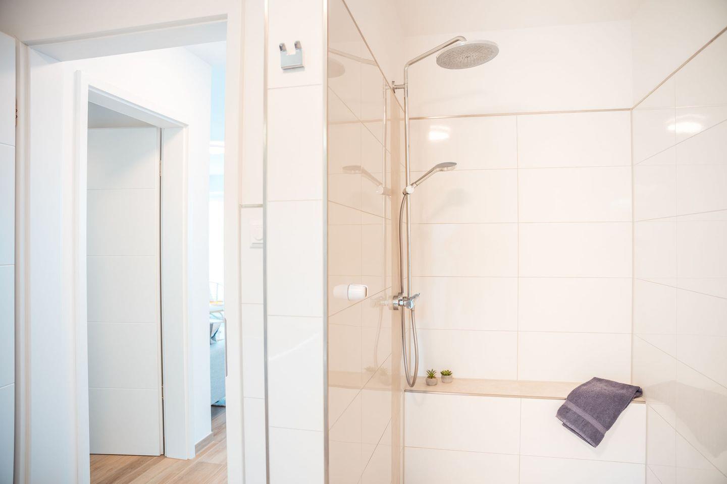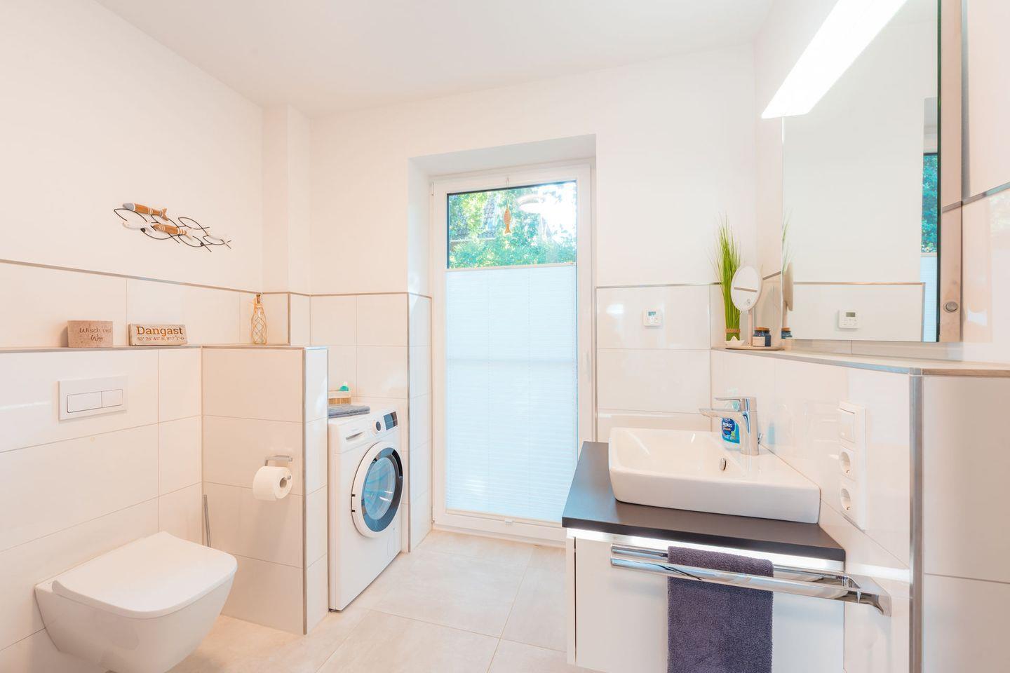 Tageslichtbad: bodentiefe, barrierefreie Sommerregendusche, Waschtischanlage mit Spiegel, Föhn, WC, Handtuchheizung, Waschmaschine, Handtücher auf Anfrage