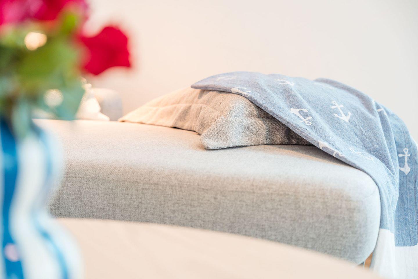 Wohnzimmer: gemütliches Sofa mit zusätzlicher Schlaffunktion, Leselampe, Flachbildfernseher, Empfang deutschsprachiger TV-Programme (SAT-Anlage) sowie Unterstützung von Streamingdiensten über Apps oder eigene Geräte, WiFi Raumlautsprecher mit Unterstützung von Mediastreaming