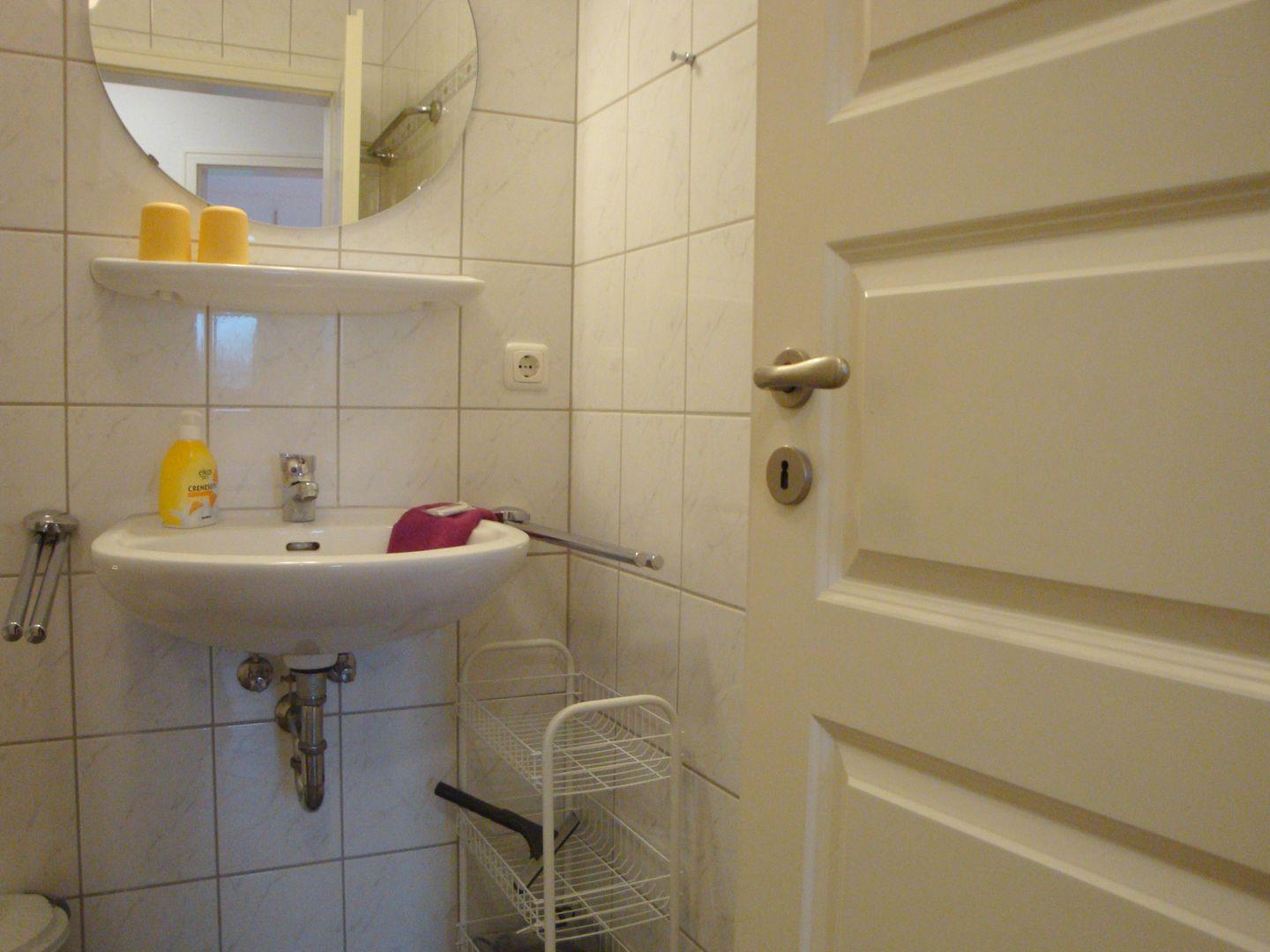 Badezimmer: 1 Badezimmer mit Dusche, Waschtisch, großer Spiegel