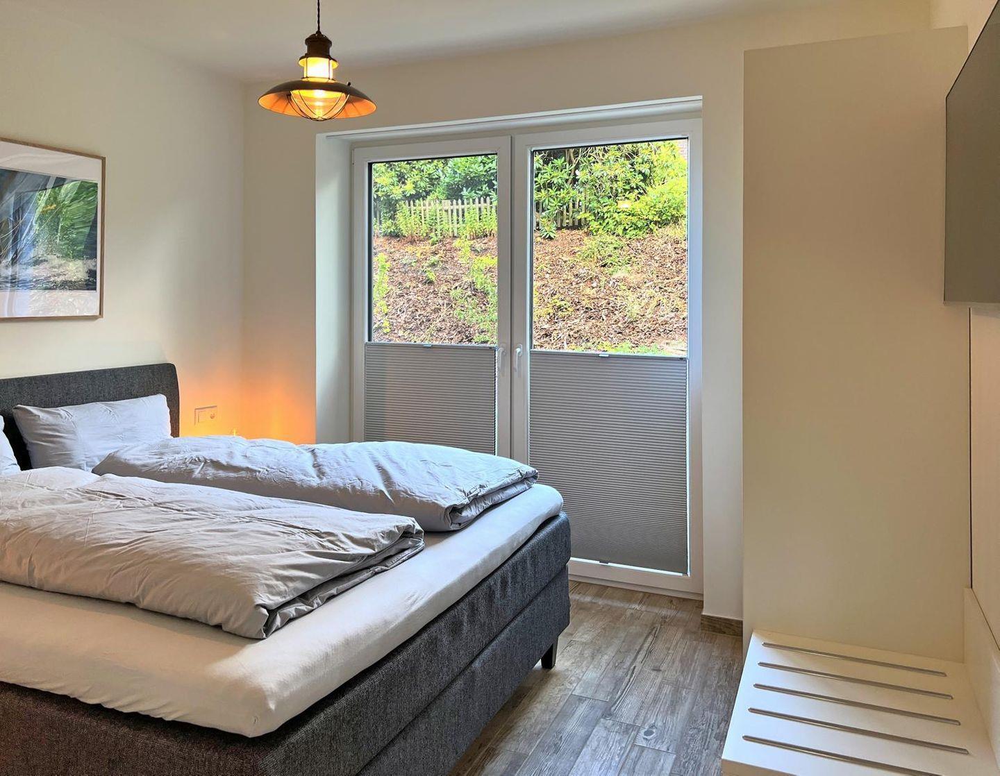 Schlafzimmer 2: Doppelbett (Maße: 180 x 200 cm), Nachttische, Leselampen, Kleiderschrank, Smart-TV, Plissees, verdunkelnde Vorhänge