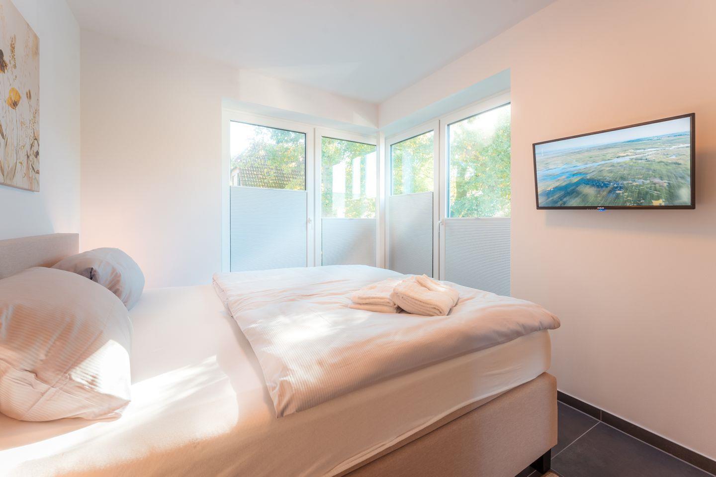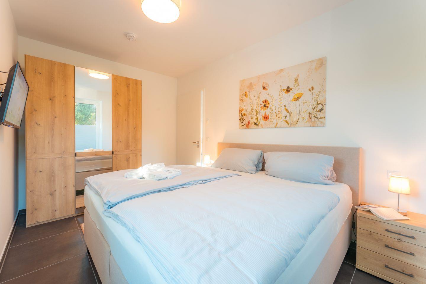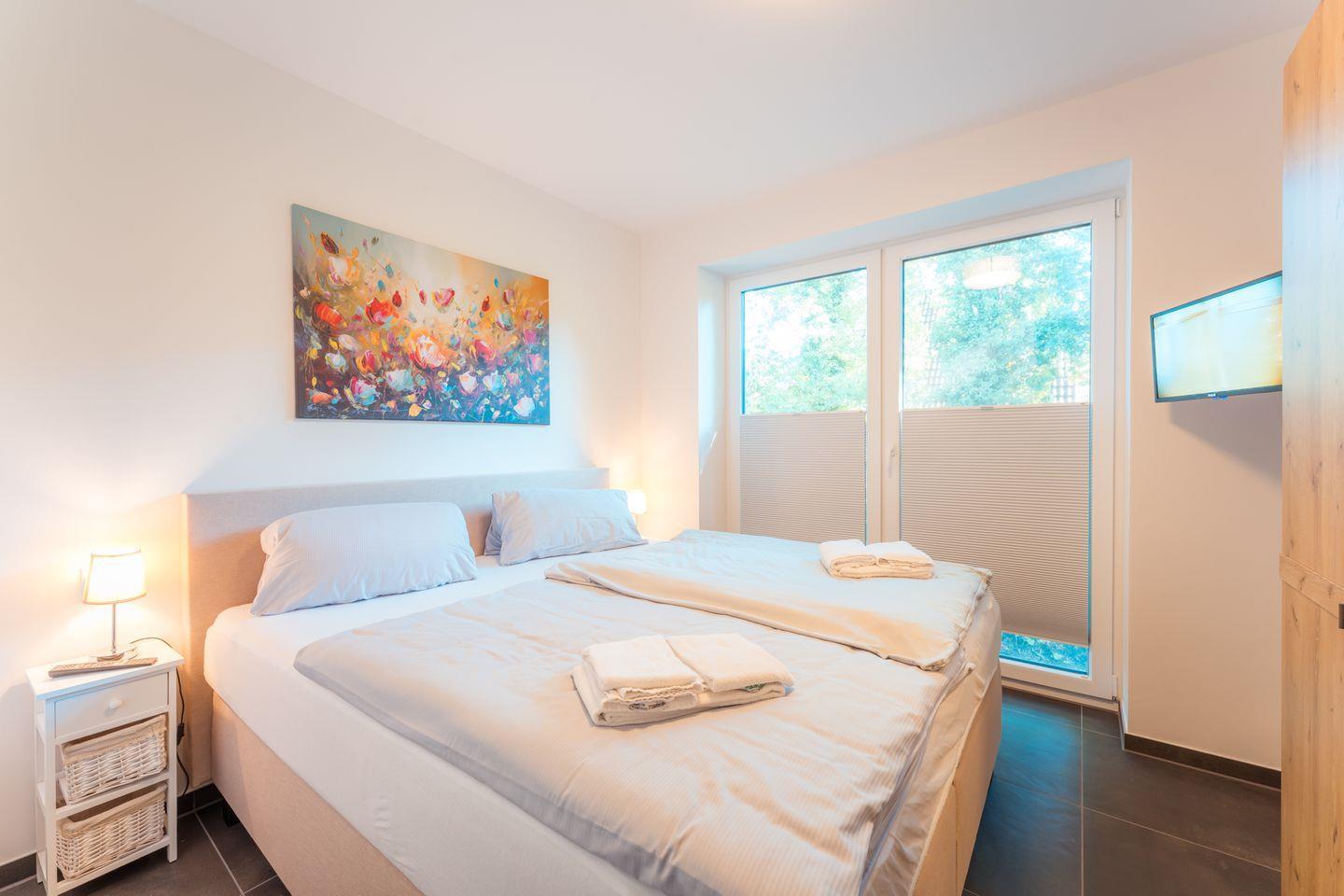 Schlafzimmer 1: Doppelbett (Boxspringbett mit einer Matratze 180x200 cm), Leselampen, Kleiderschrank, Verdunklungsplissees, Flachbildfernseher, Bettwäsche auf Anfrage