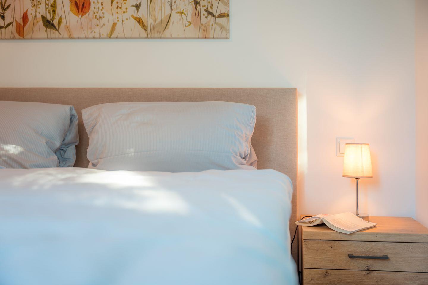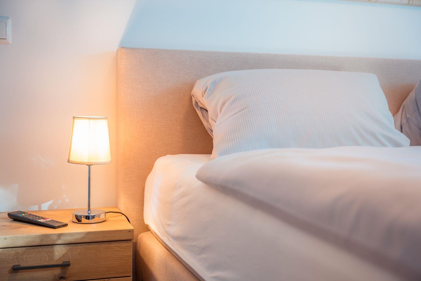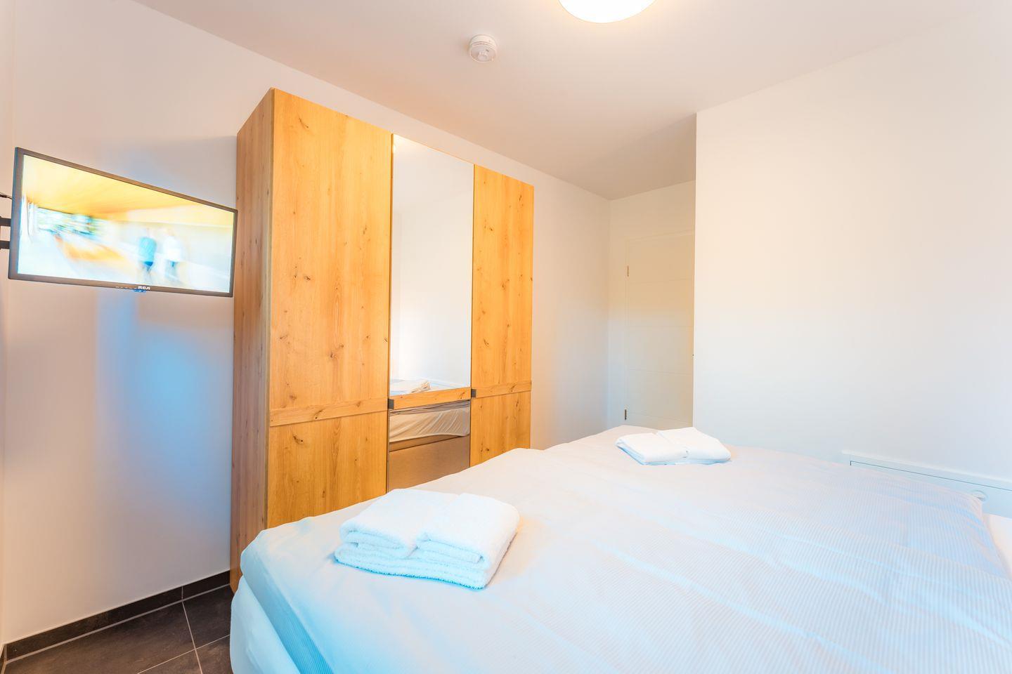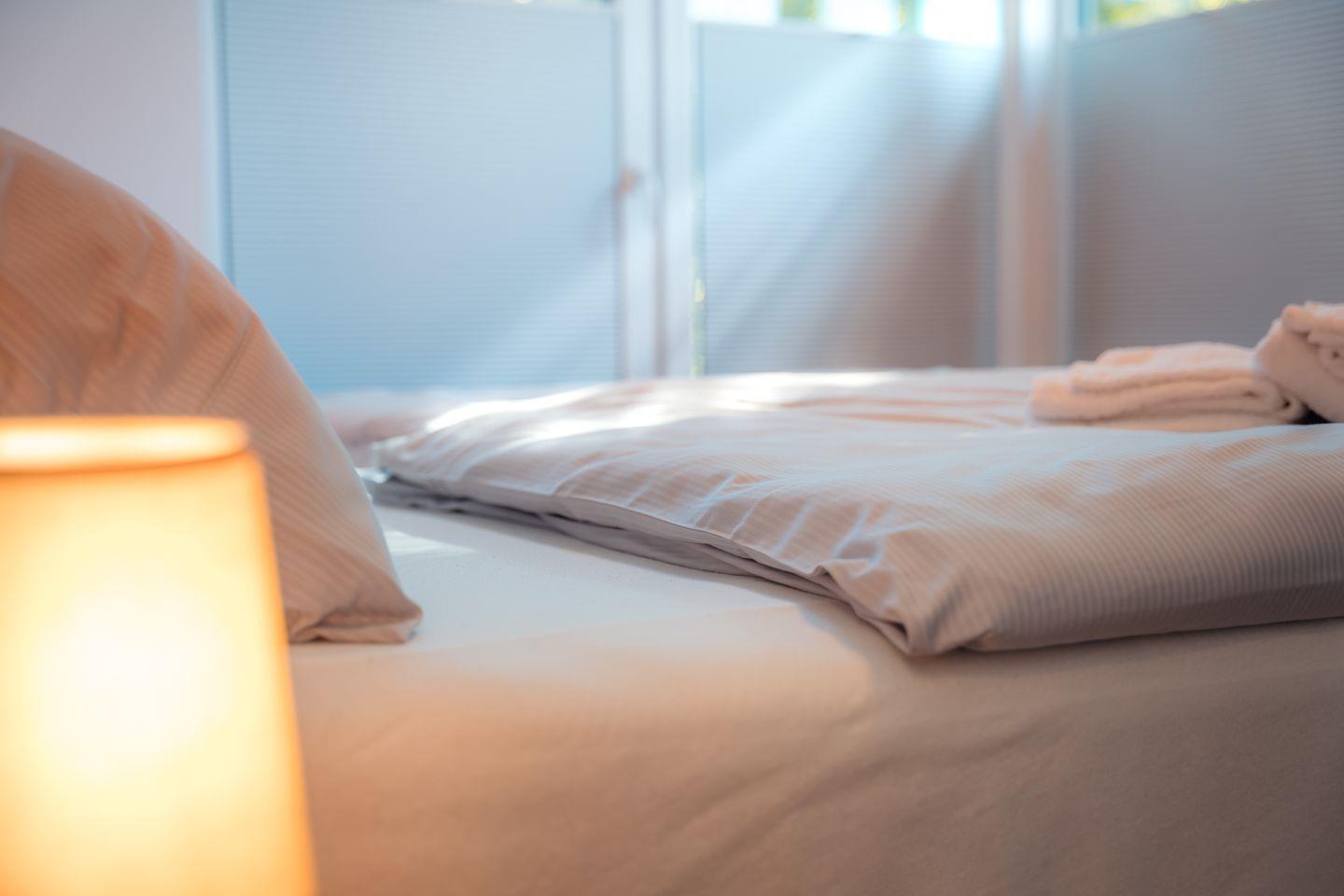 Schlafzimmer 1: Doppelbett (Boxspringbett mit einer Matratze 180x200 cm), Leselampen, Kleiderschrank, Verdunklungsplissees, Flachbildfernseher, Bettwäsche auf Anfrage