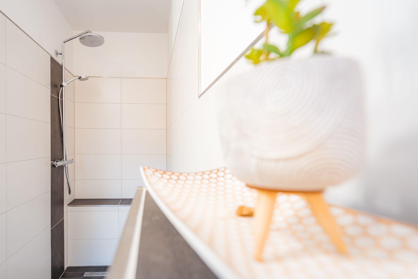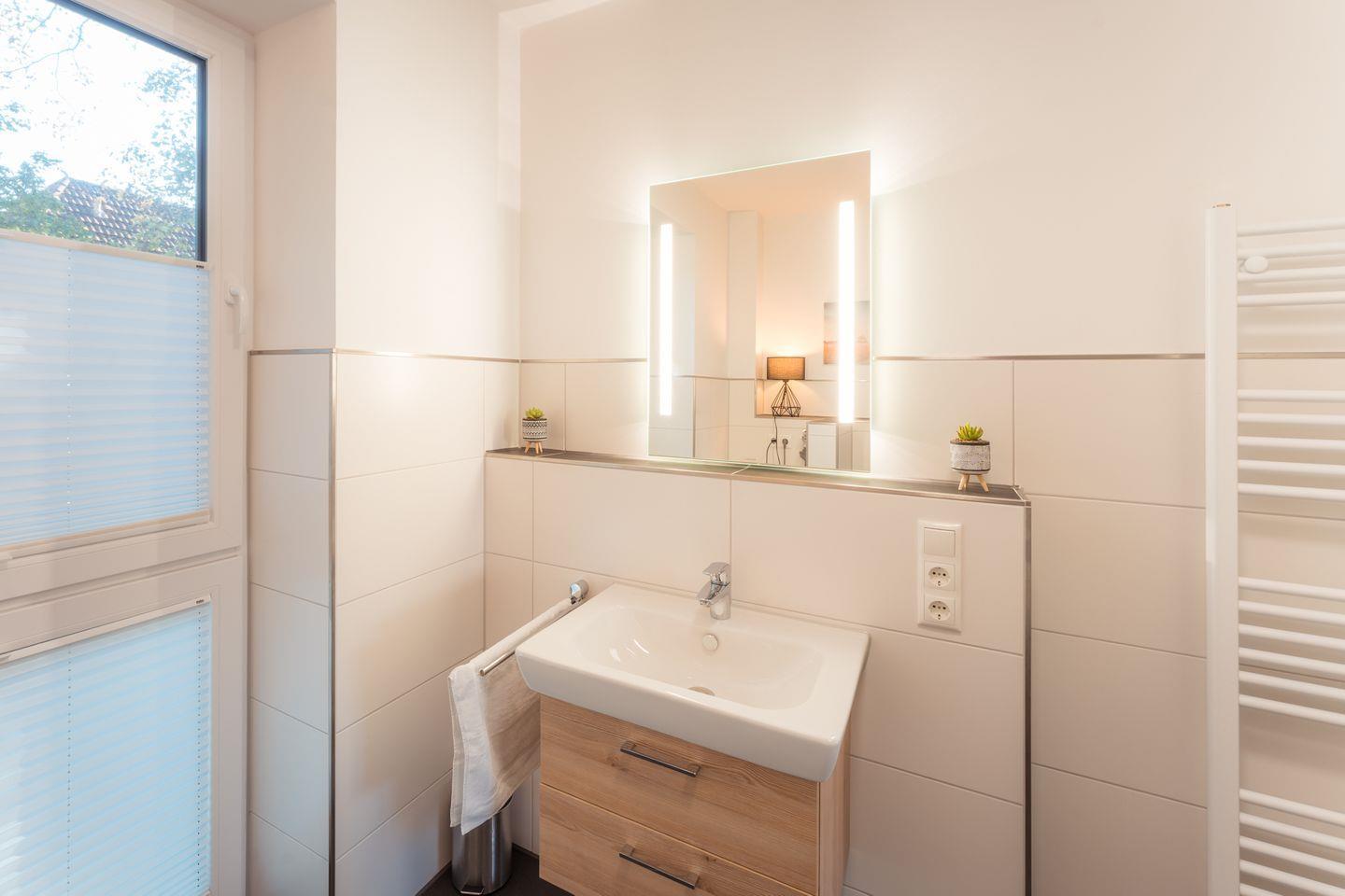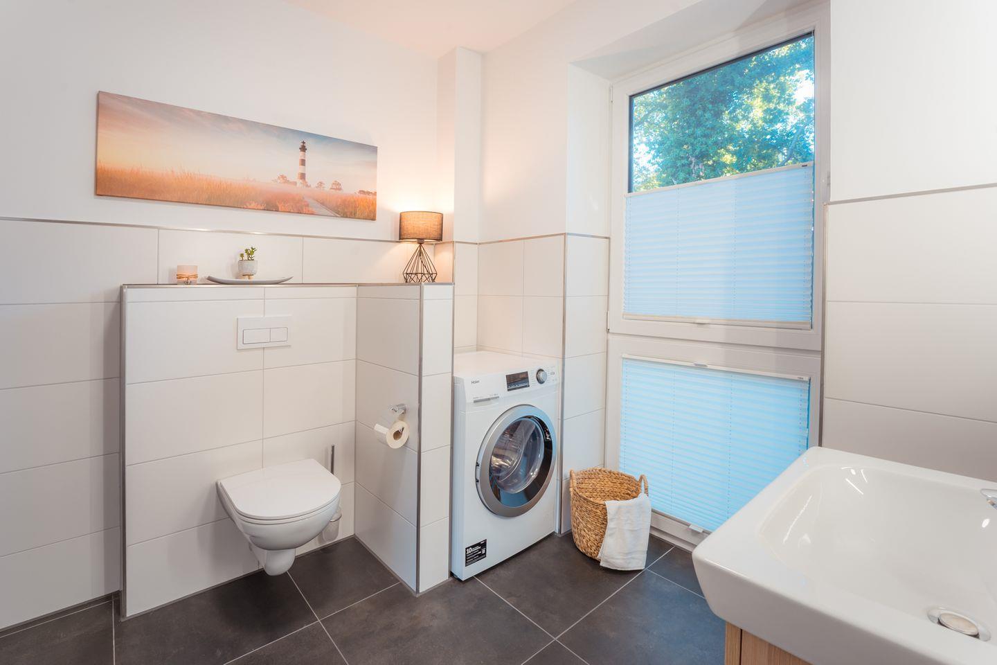 Tageslichtbad: bodentiefe, barrierefreie Sommerregendusche, Waschtischanlage mit Spiegel, Föhn, WC, Handtuchheizung, Waschmaschine, Handtücher auf Anfrage