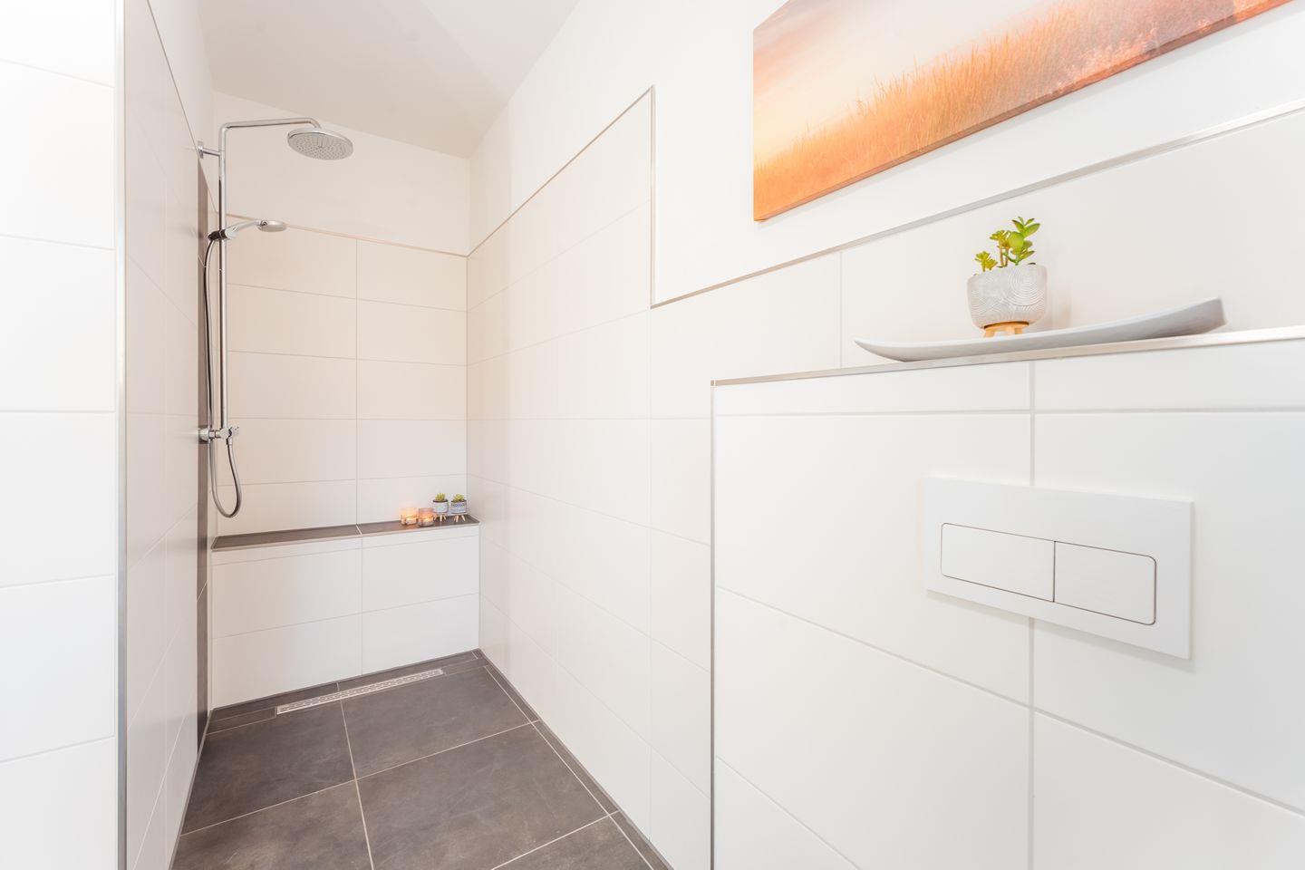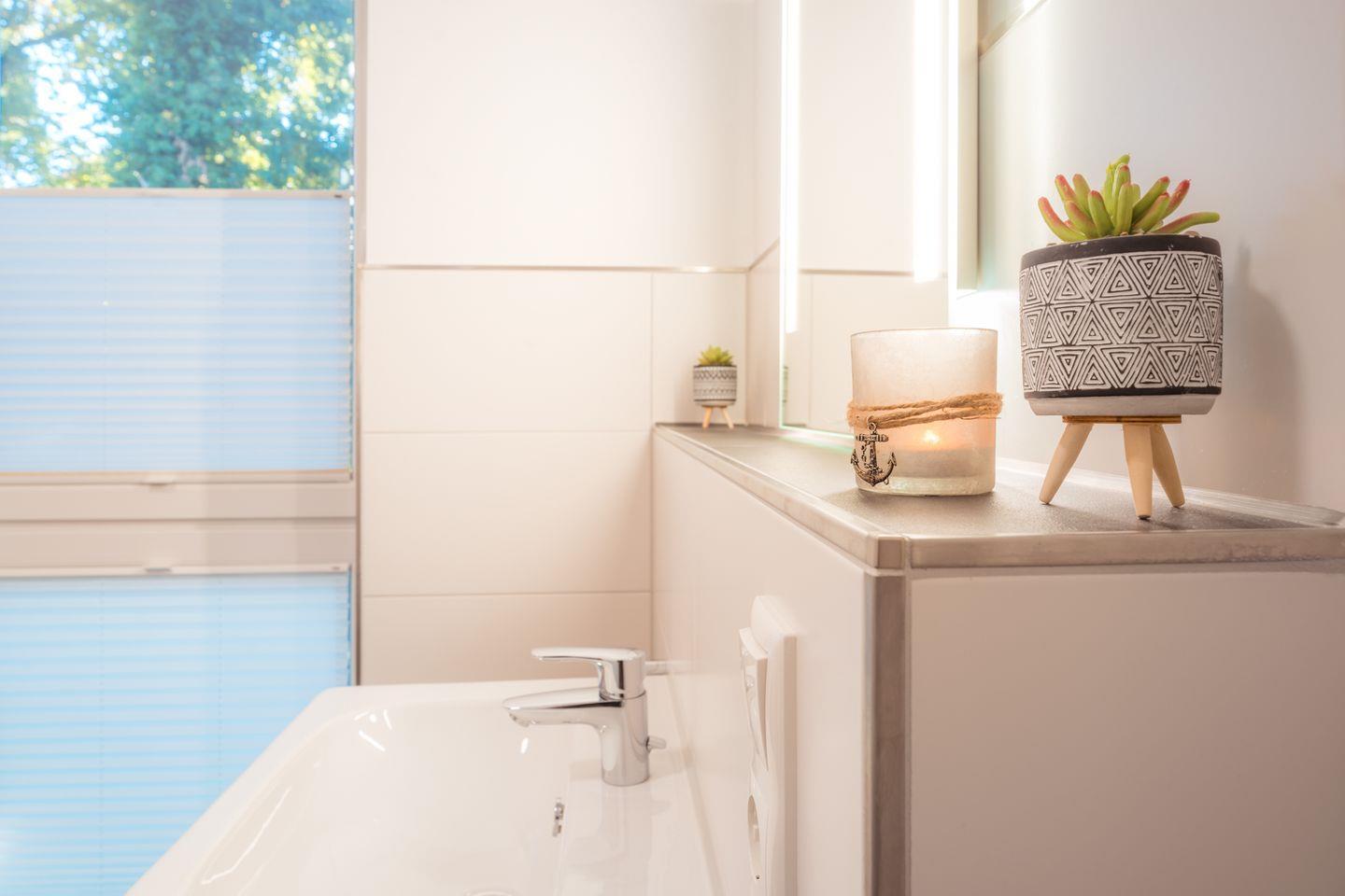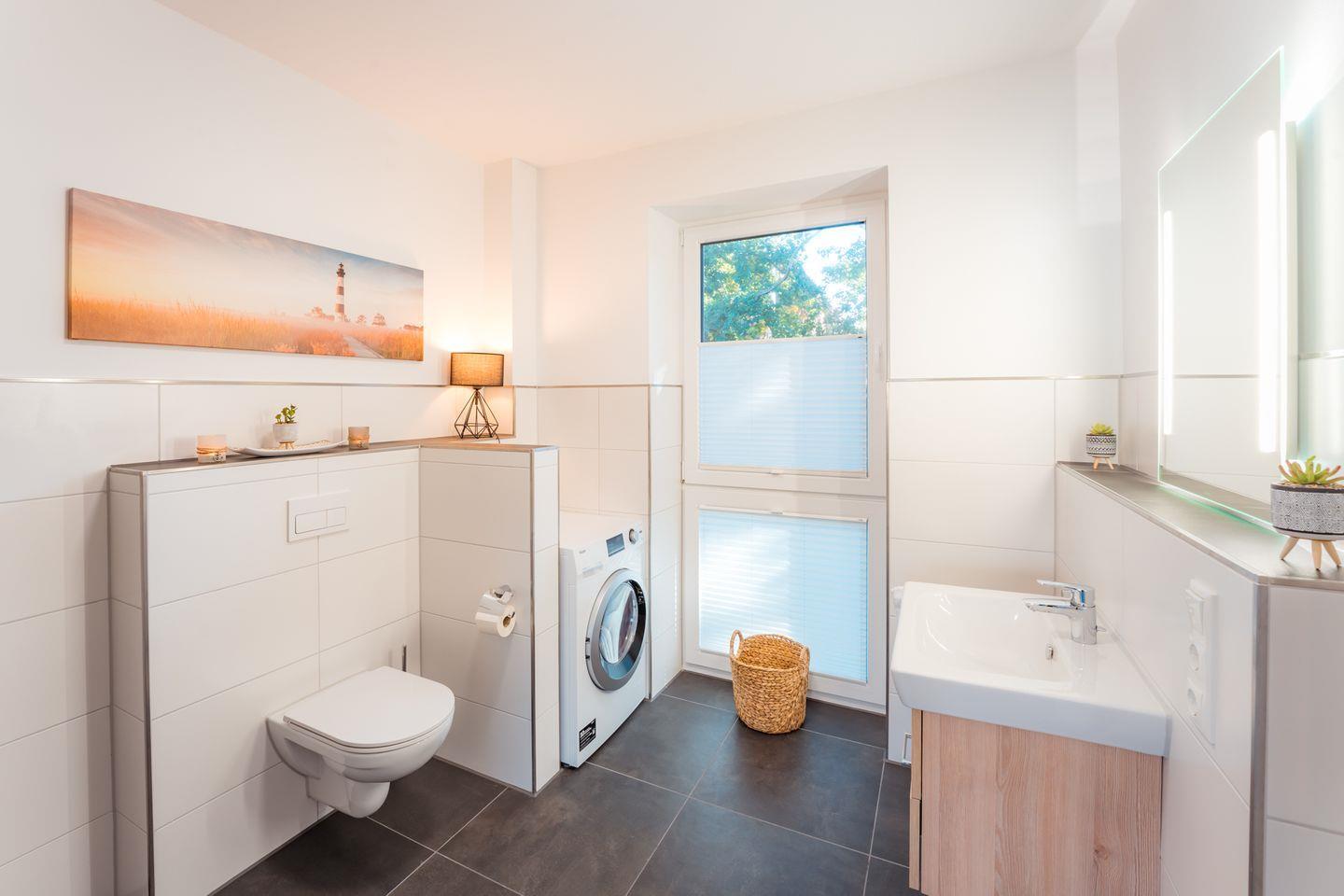 Tageslichtbad: bodentiefe, barrierefreie Sommerregendusche, Waschtischanlage mit Spiegel, Föhn, WC, Handtuchheizung, Waschmaschine, Handtücher auf Anfrage