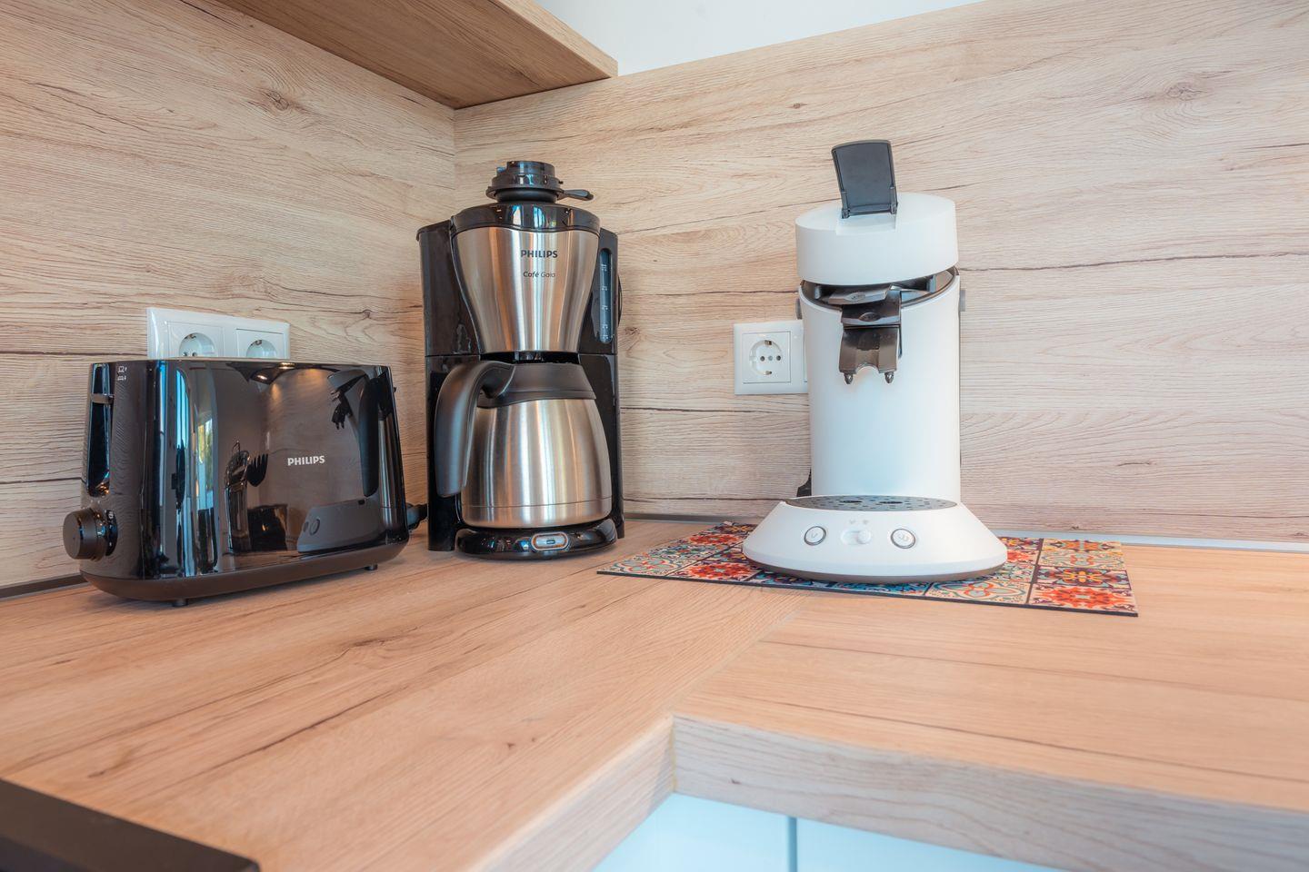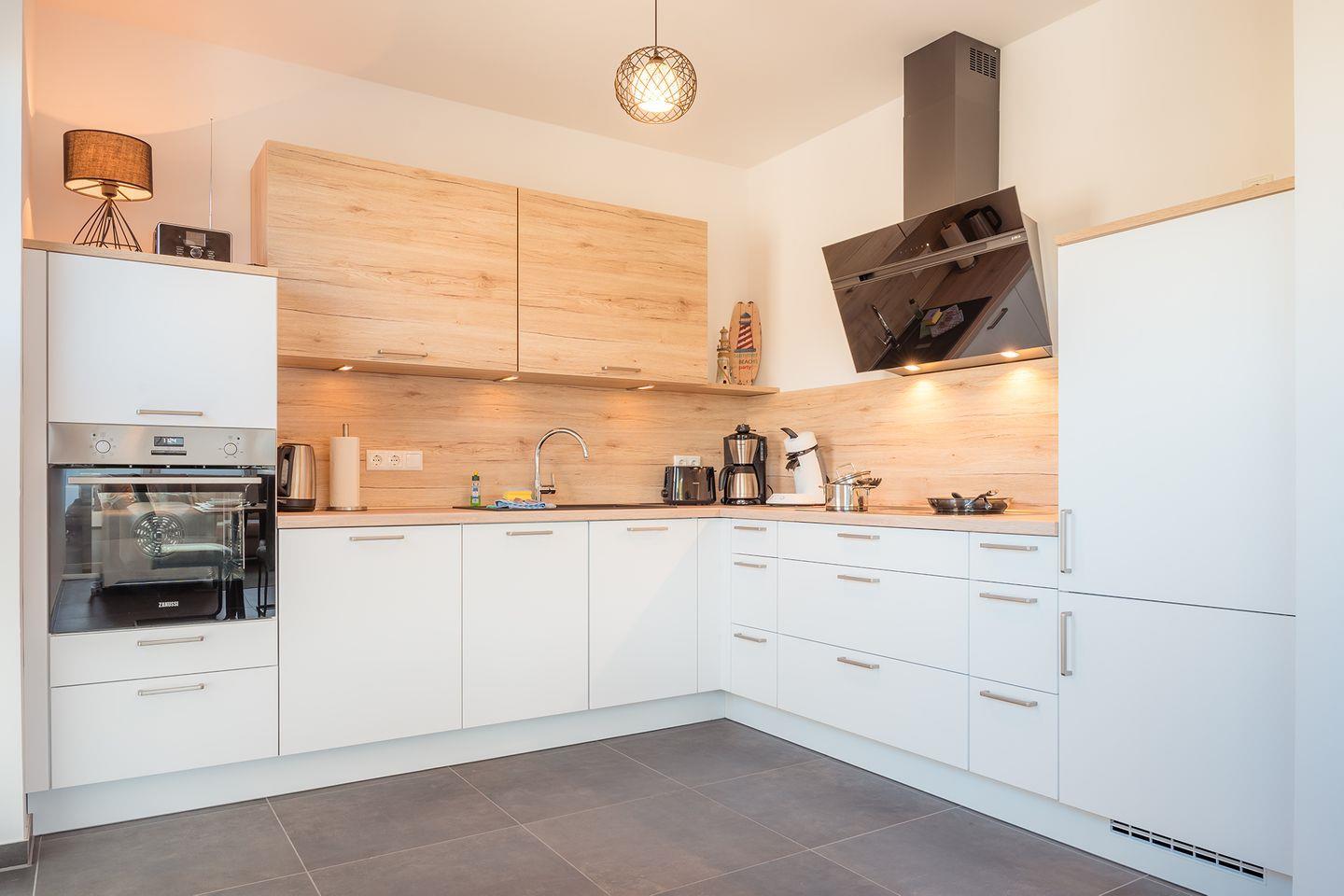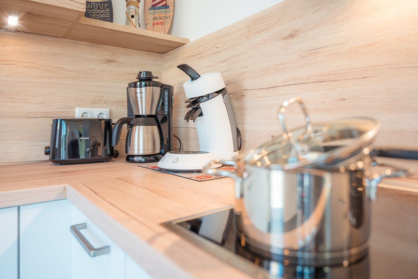 Küche und Haushalt: Einbauküche, Kühlschrank mit kombinierten Gefrierfächern (2 Stück), 4-Zonen Cerankochfeld, Dunstabzug, Mikrowelle, Backofen, Geschirrspüler, Toaster, Eierkocher, Wasserkocher, Kaffeefiltermaschine (Filtergröße 4), Kaffeemaschine Senseo, hochwertiges Geschirr und Besteck