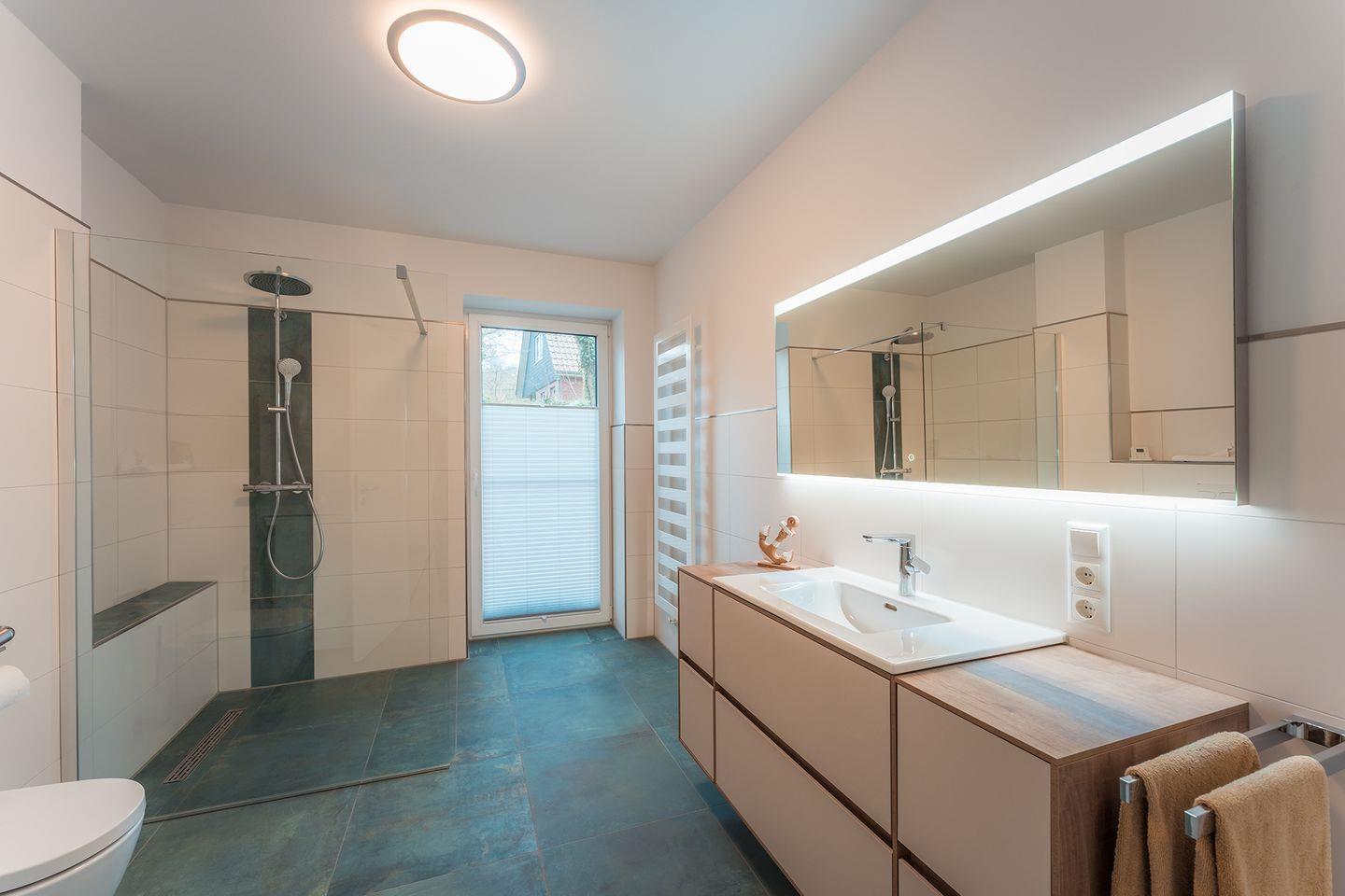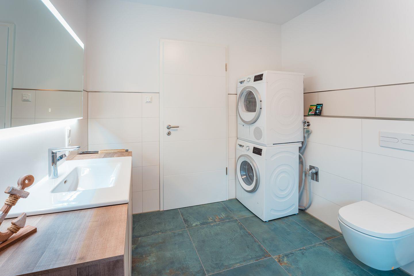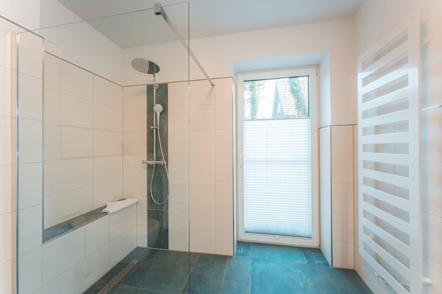 Tageslichtbad: bodentiefe, barrierefreie Sommerregendusche, Waschtischanlage mit Spiegel, Föhn, WC, Handtuchheizung, Waschmaschine, Trockner, Sichtschutz durch Plissees, Handtücher auf Anfrage