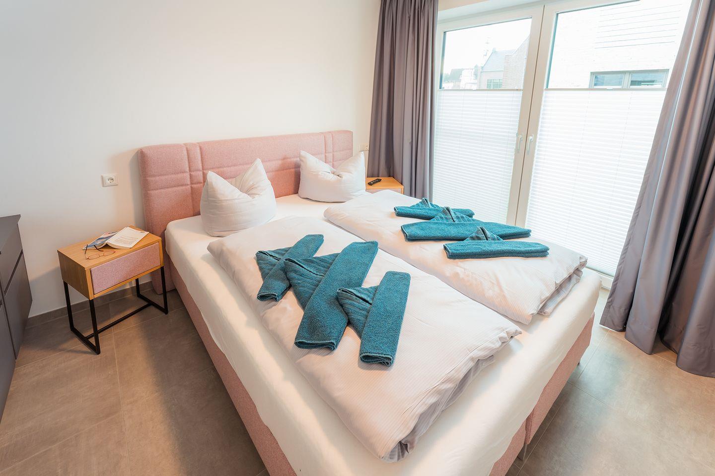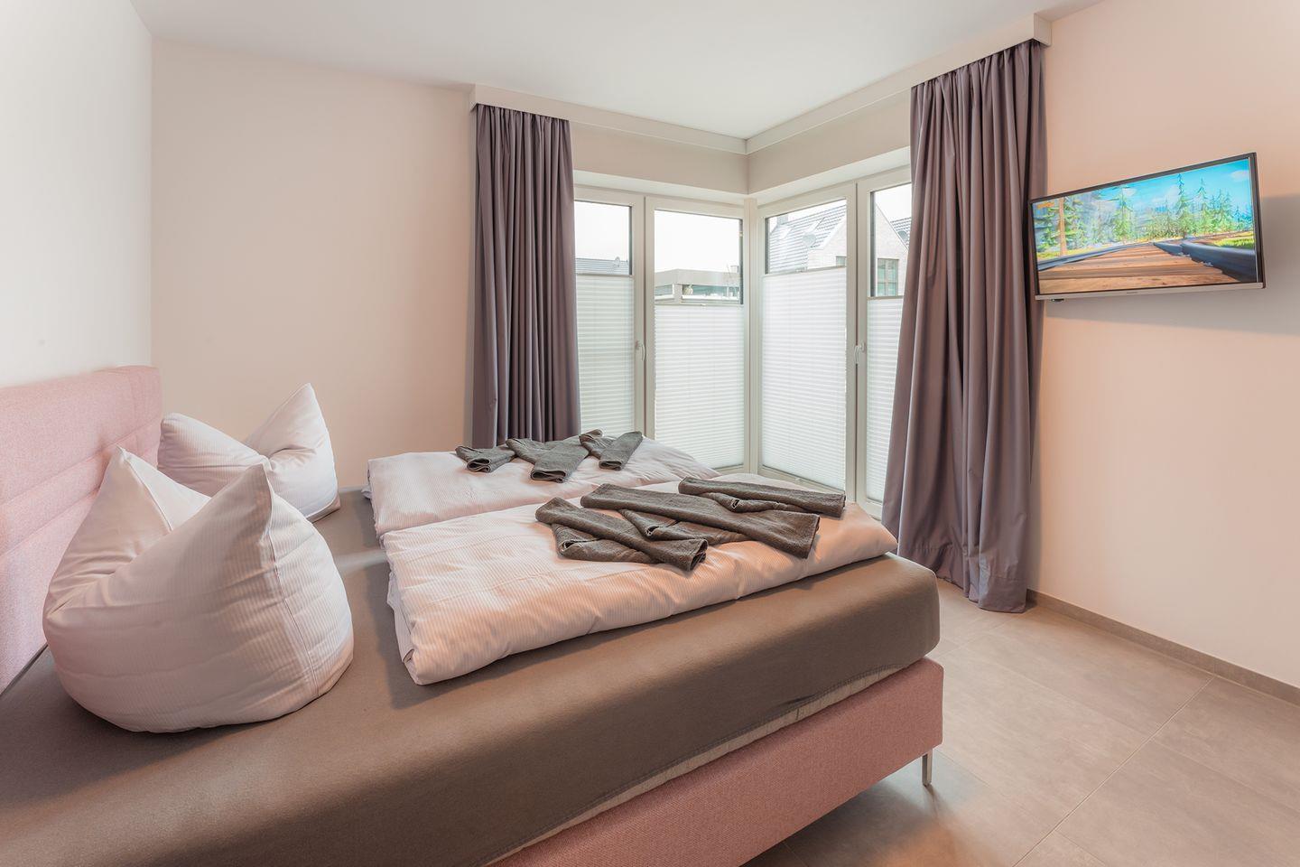 Schlafzimmer 1: Doppelbett (1 Matratze 180x200 cm), Leselampen, Kleiderschrank, Verdunklungsvorhänge, Flachbildfernseher, Bettwäsche auf Anfrage