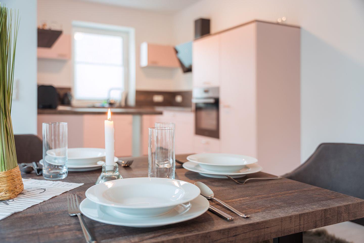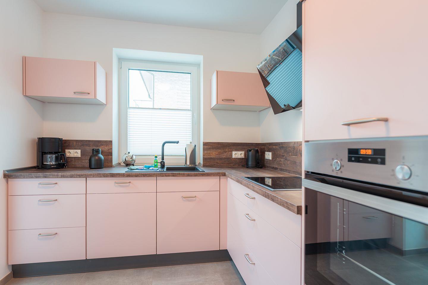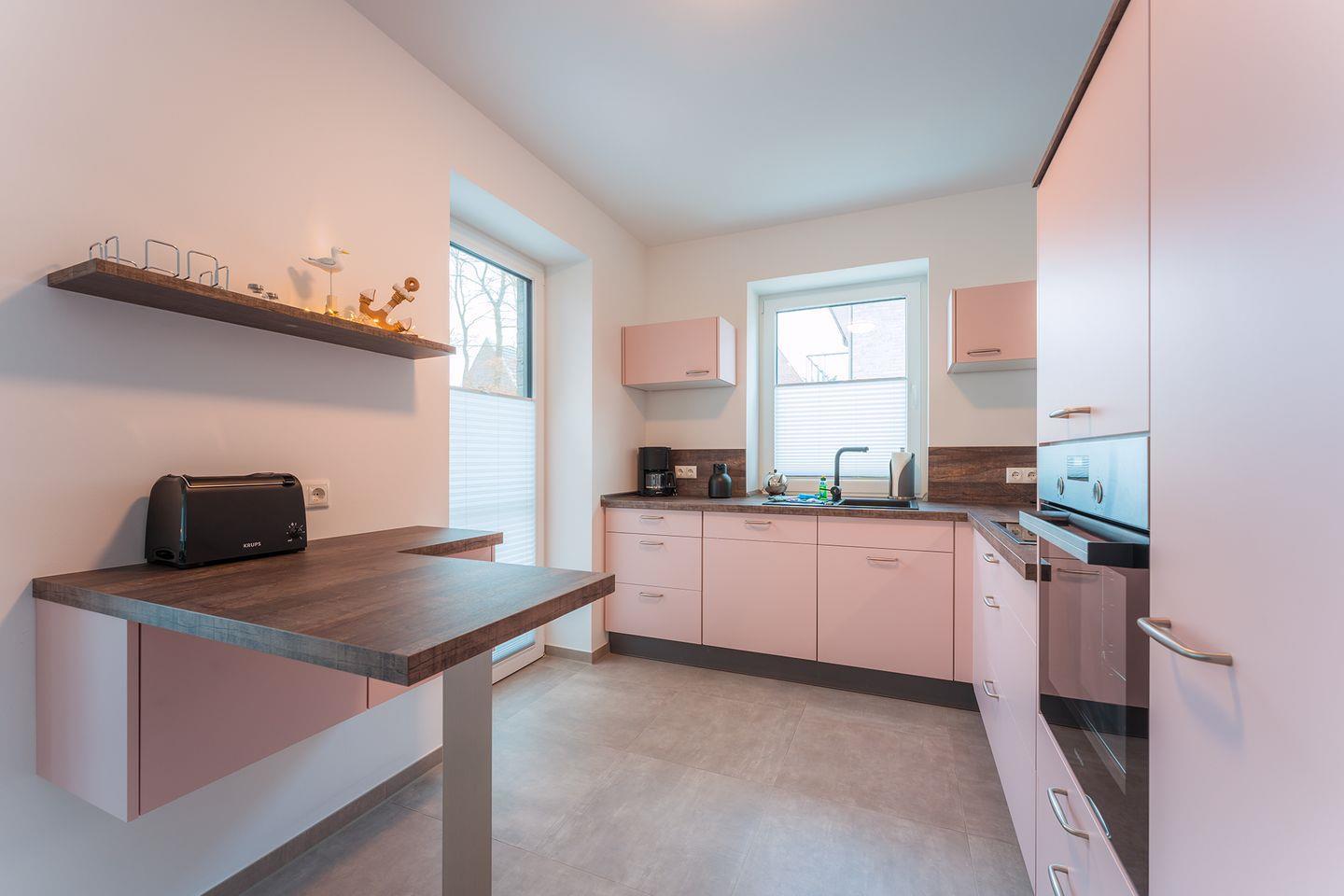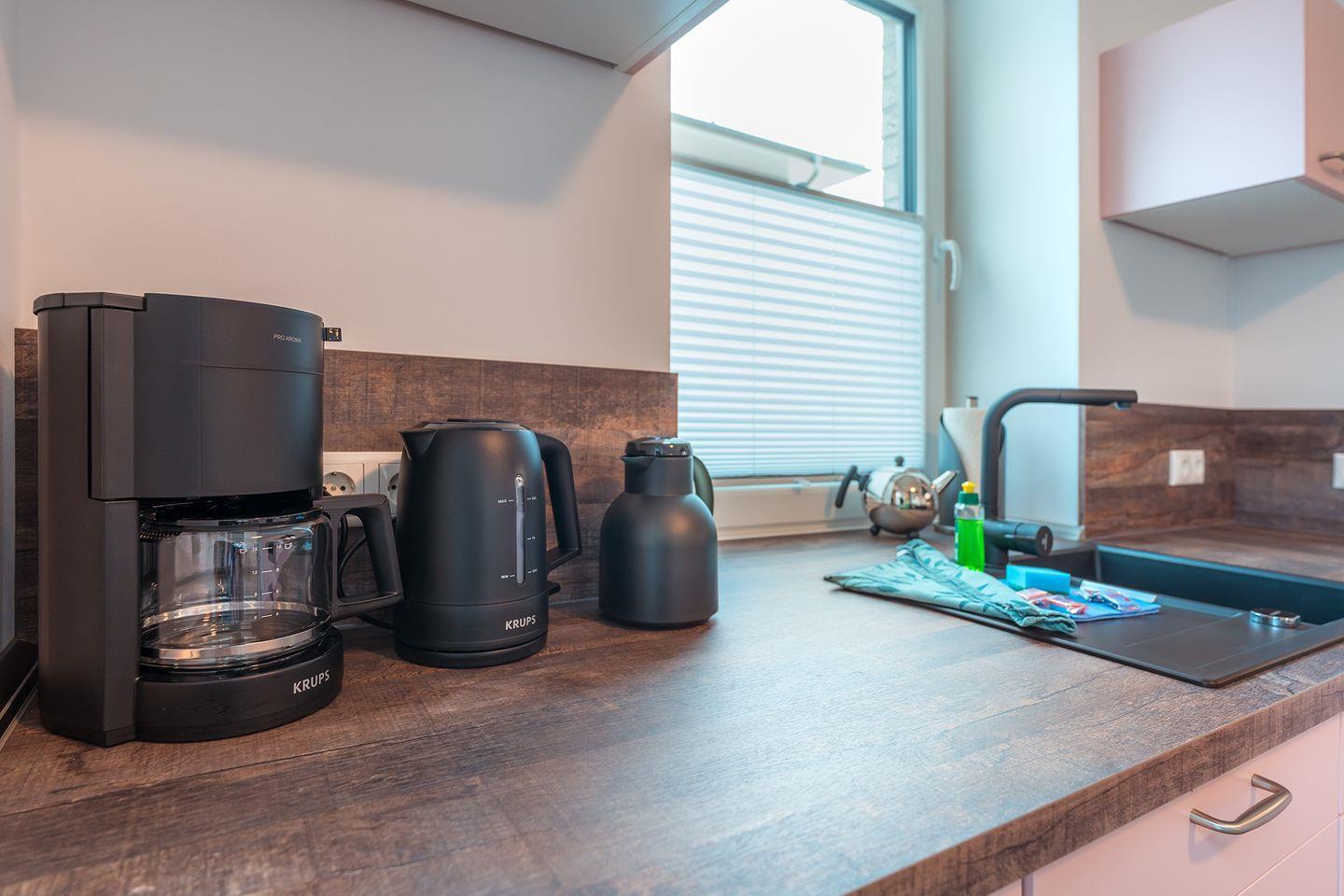 Küche und Haushalt: Einbauküche, Kühlschrank mit kombiniertem Gefrierfach, 4-Zonen Cerankochfeld, Dunstabzugshaube, Backofen, Geschirrspüler, Mikrowelle, Toaster, Wasserkocher, Kaffeefiltermaschine (Filtergröße 4), hochwertiges Geschirr und Besteck