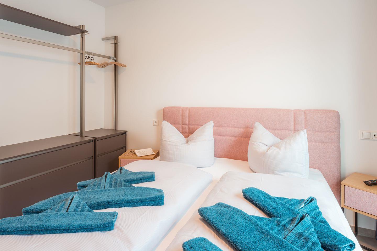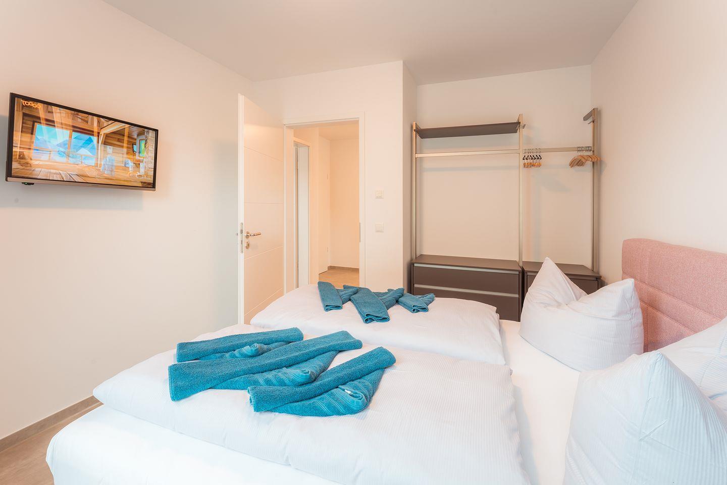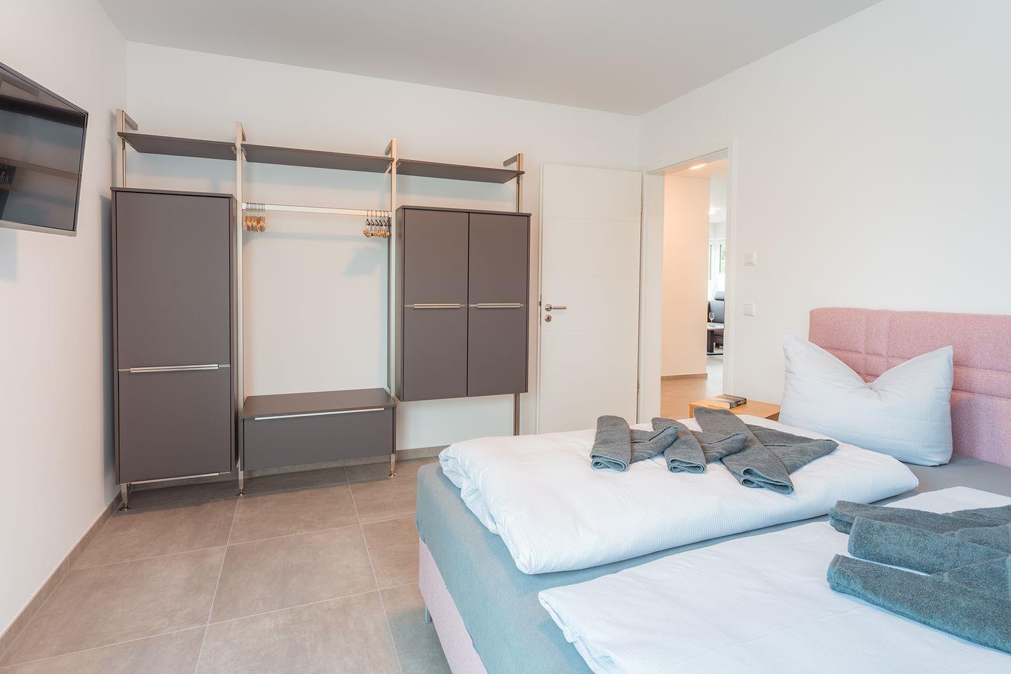 Schlafzimmer 2: Doppelbett (1 Matratze 160x200 cm) , Leselampen, Kleiderschrank, Verdunklungsvorhänge, Flachbildfernseher, Bettwäsche auf Anfrage