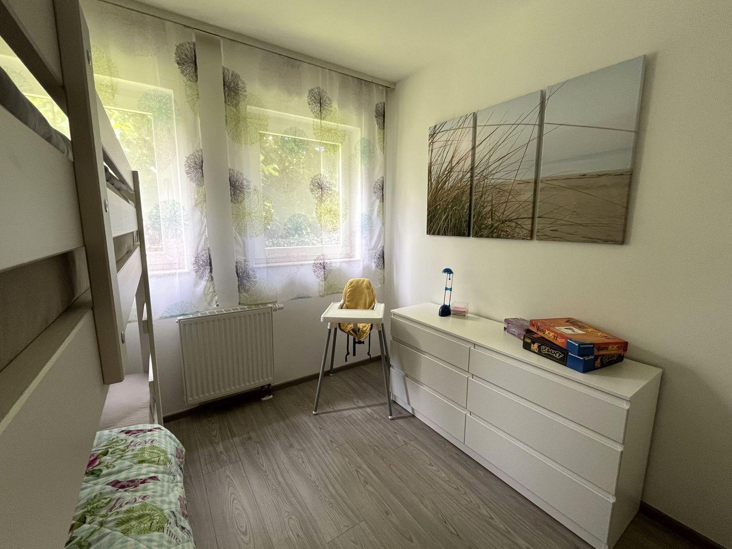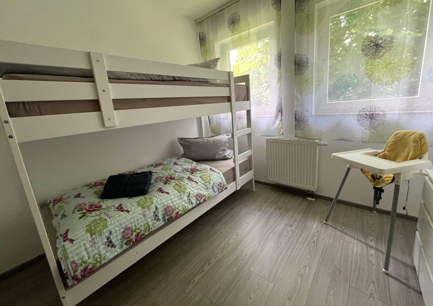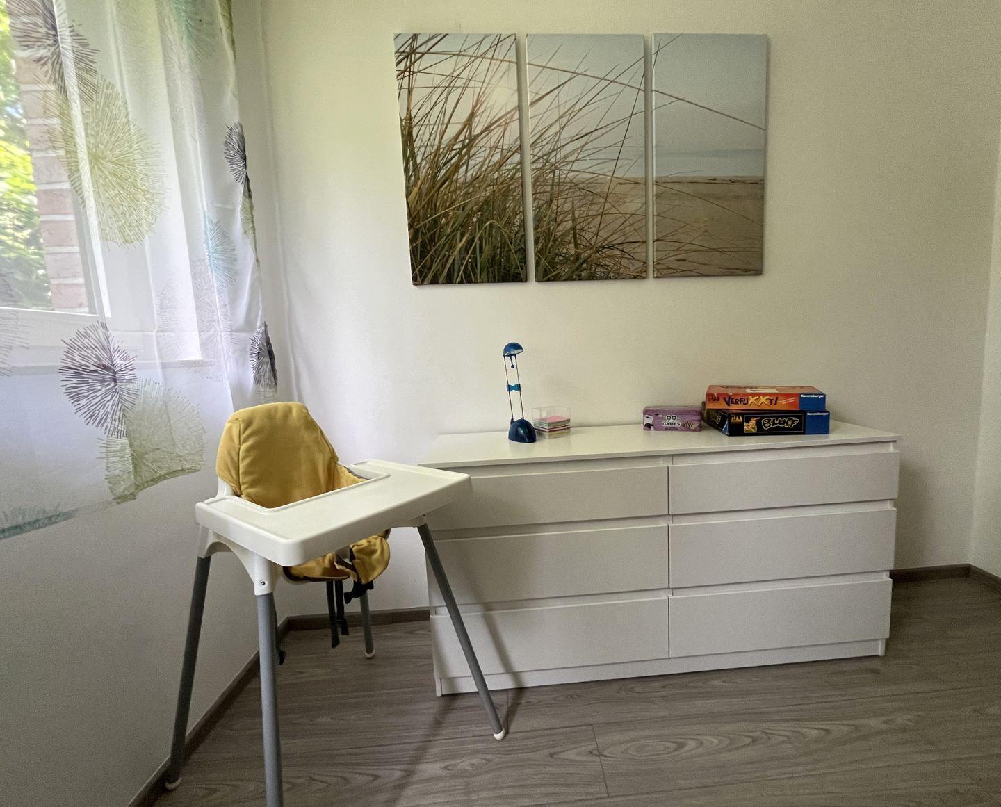 Kinderbett und Hochstuhl sind in der Wohnung vorhanden