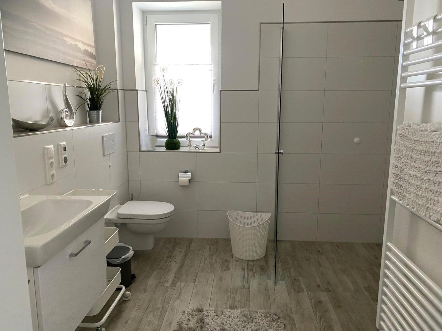 Bad: Badezimmer mit Regendusche, integriertes WLAN-Radio, Waschtischanlage mit beleuchtetem Spiegel, Handtuchheizung