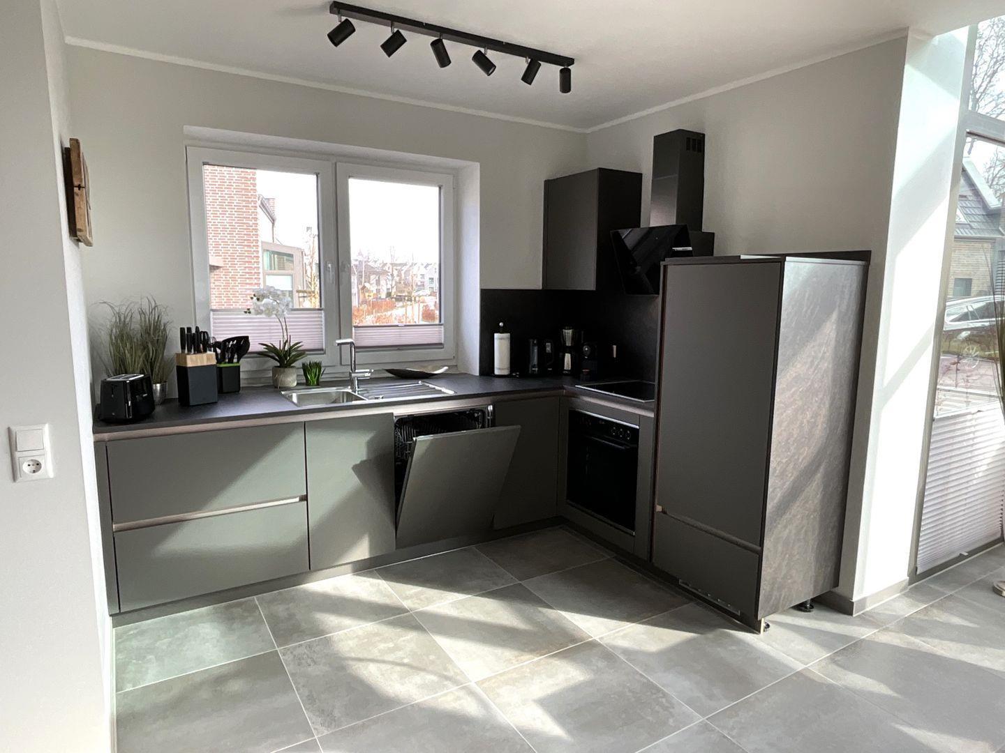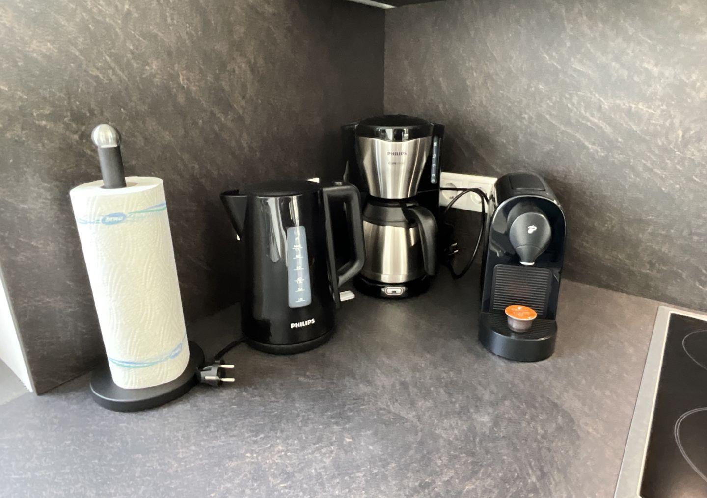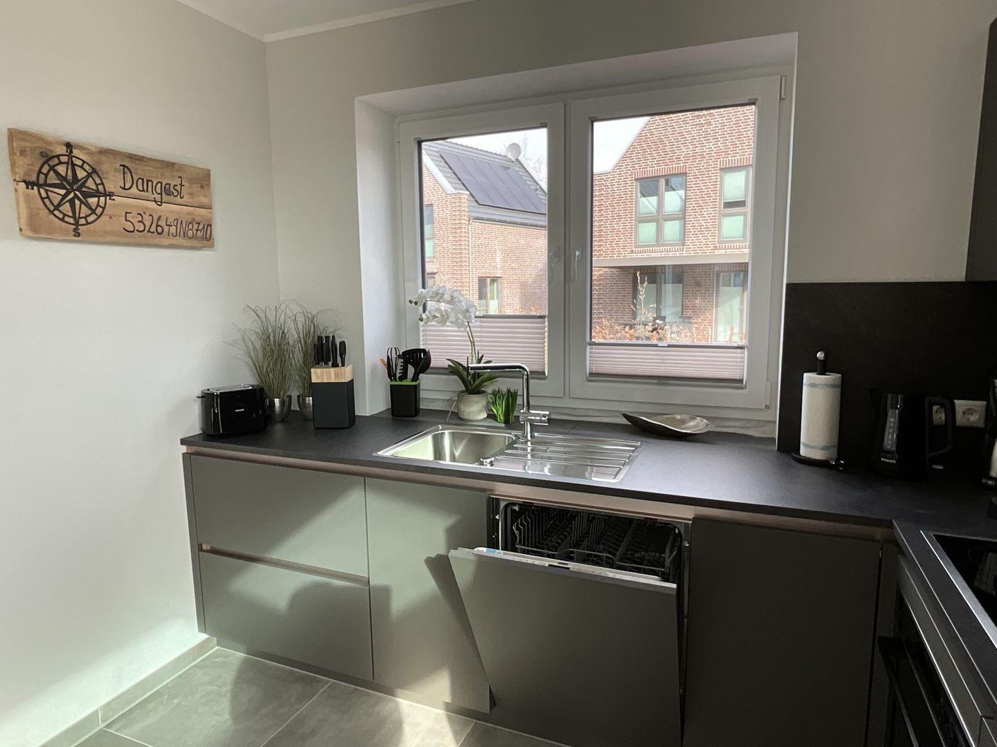 Küche und Haushalt: Einbauküche, Kühlschrank mit Gefrierfach, 4-Zonen Cerankochfeld, Backofen, Mikrowelle, Dunstabzugshaube, Geschirrspüler, Kaffeefiltermaschine, Cafissimo Kaffee-Kapselmaschine, Toaster, Wasserkocher, hochwertiges Geschirr und Besteck, Schneidebretter.