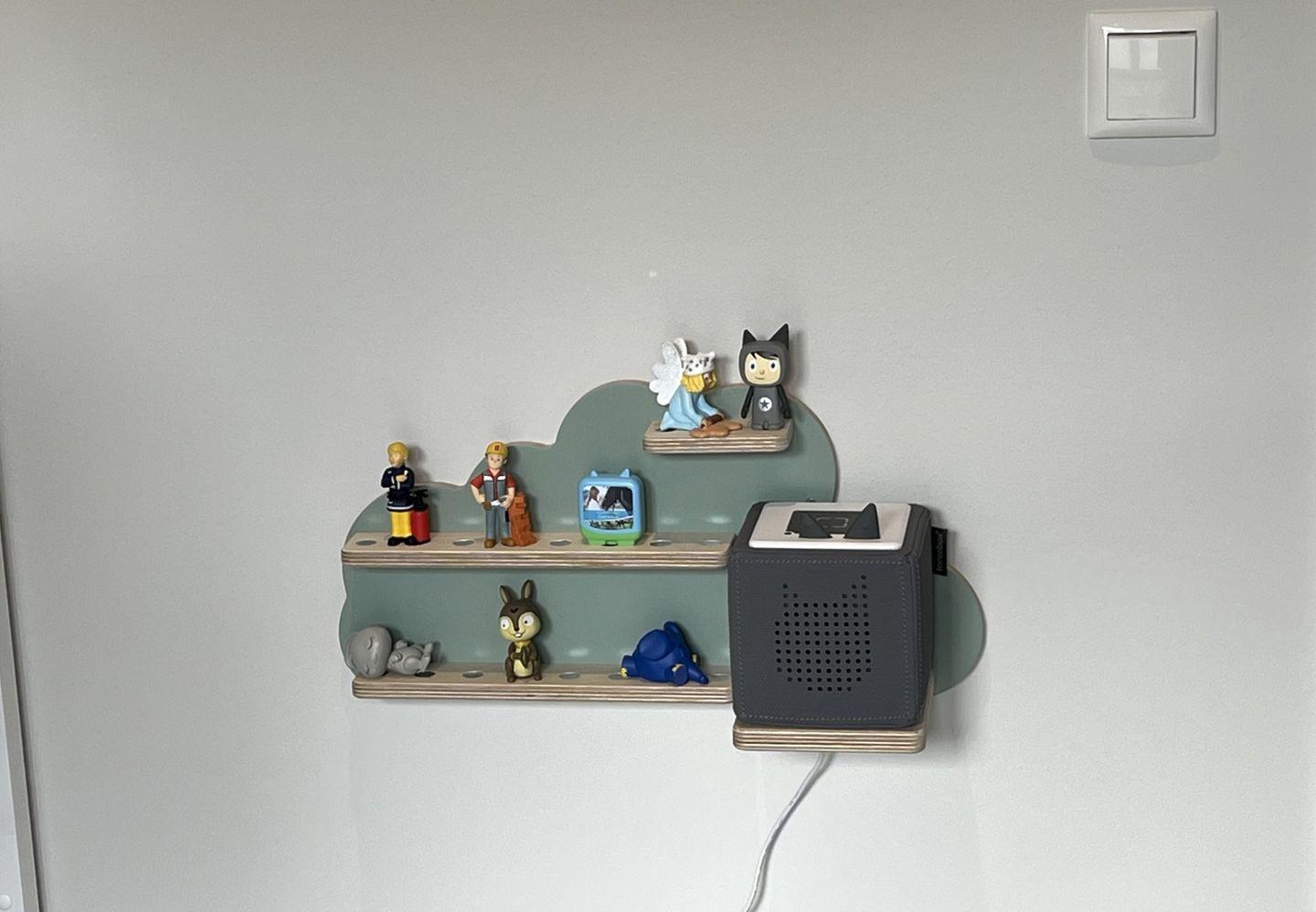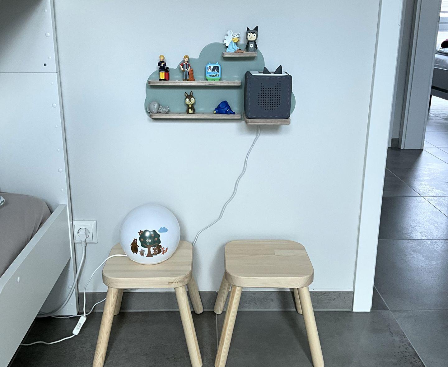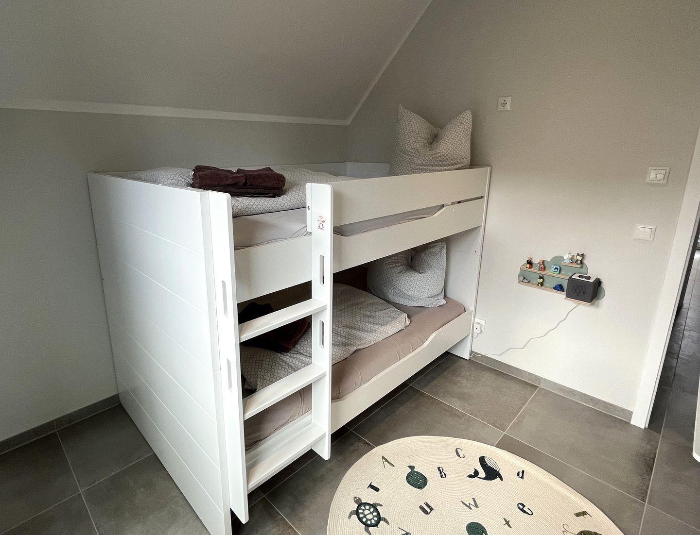 Schlafzimmer 3: extrabreites Etagenbett ( 2 Einzelmatratzen 120x200 cm), Wickelkommode, Kleiderschrank, Toniebox mit 8 Tonies, Verdunkelungsvorhänge