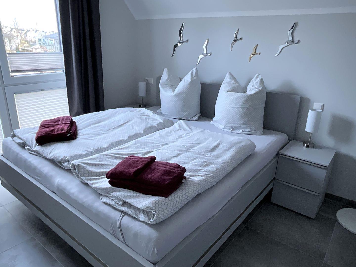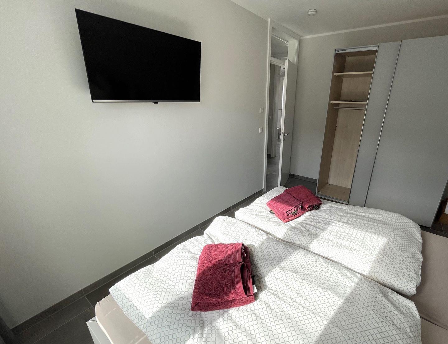 Schlafzimmer 2: Doppelbett (Maße: 180 x 200 cm, 2 Einzelmatratzen 90x200 cm), Nachttische, Kleiderschrank, Flachbildfernseher (Smart TV), Verdunkelungsvorhänge