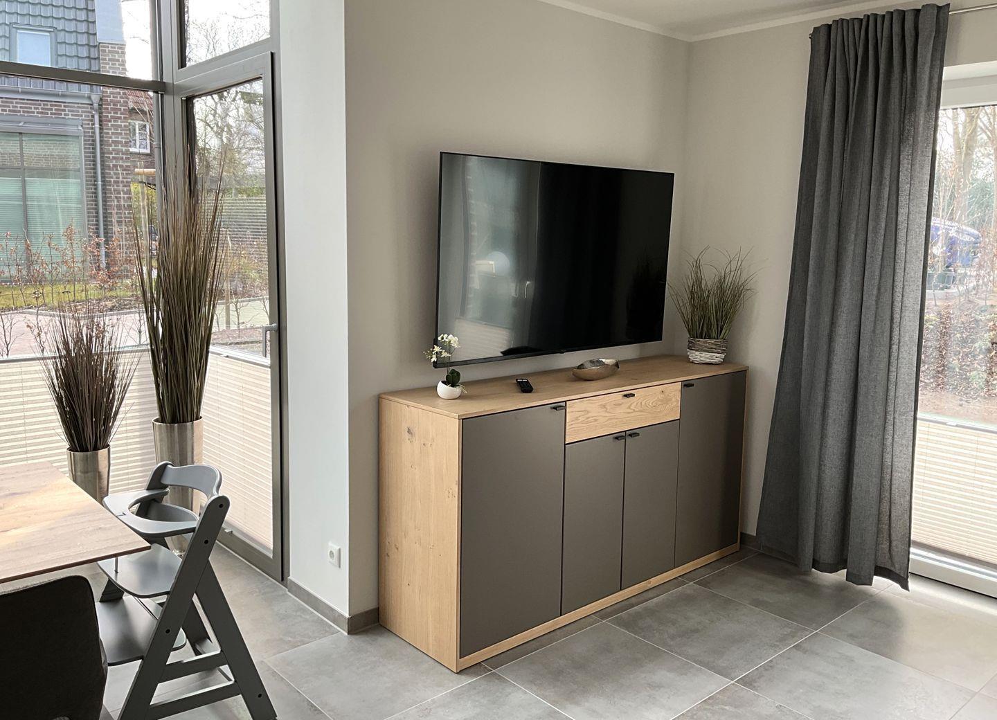 Wohn-Esszimmer: große gemütliche Eckcouch, Flachbildfernseher (Smart TV), Empfang deutschsprachiger TV-Programme (SAT-Anlage), großer Esstisch mit 6 Stühlen als Mittelpunkt im Erdgeschoss