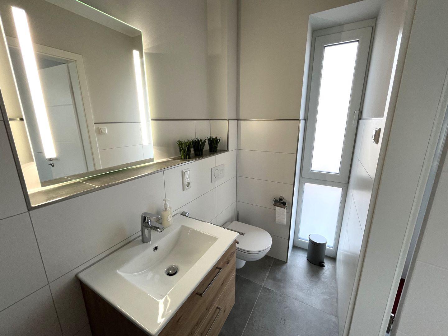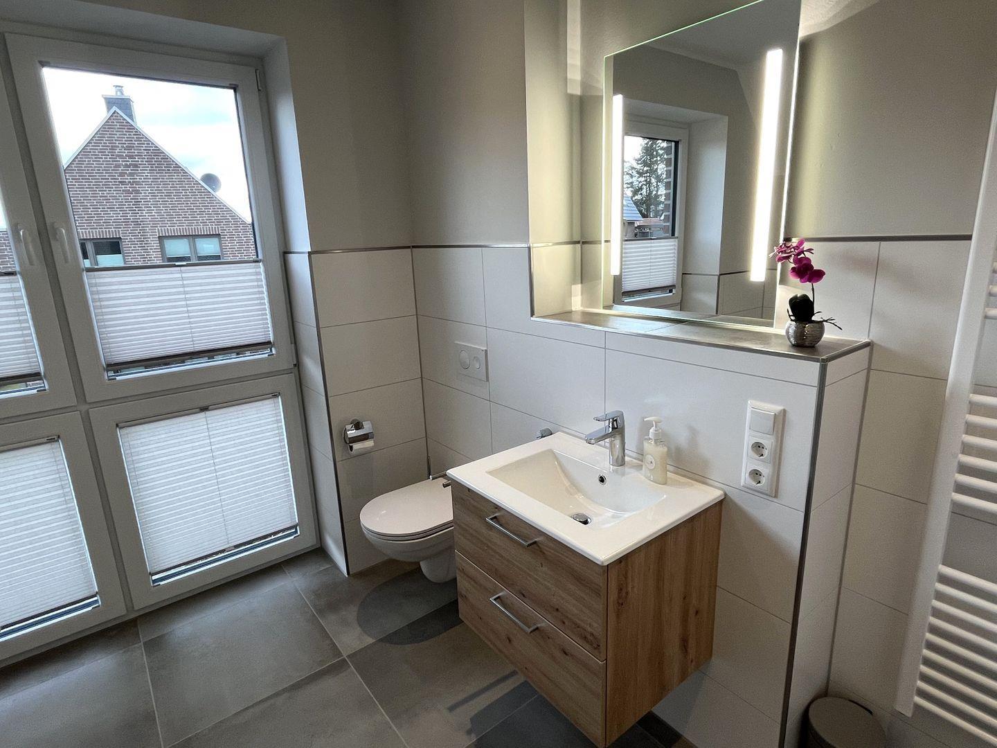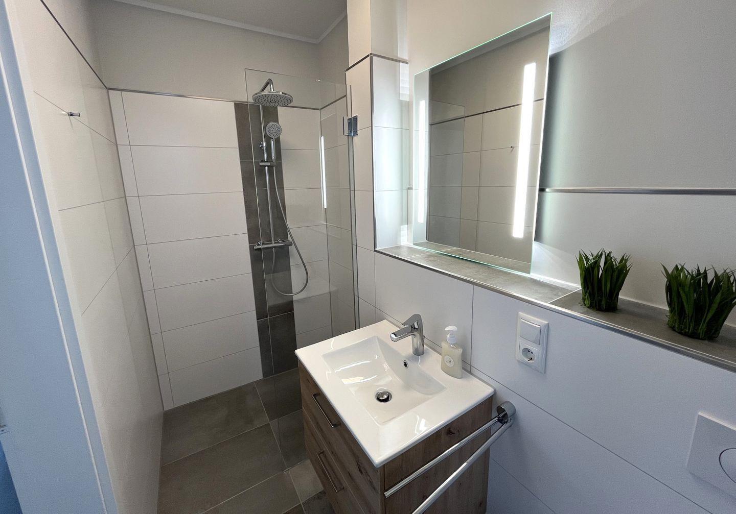 Bad und Sanitär im 1. OG: bodentiefe, barrierefreie Sommerregendusche, Badewanne, Waschtischanlage mit Spiegel, WC, Handtuchheizung, Föhn, Handtücher auf Anfrage