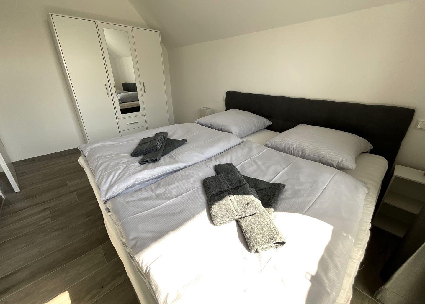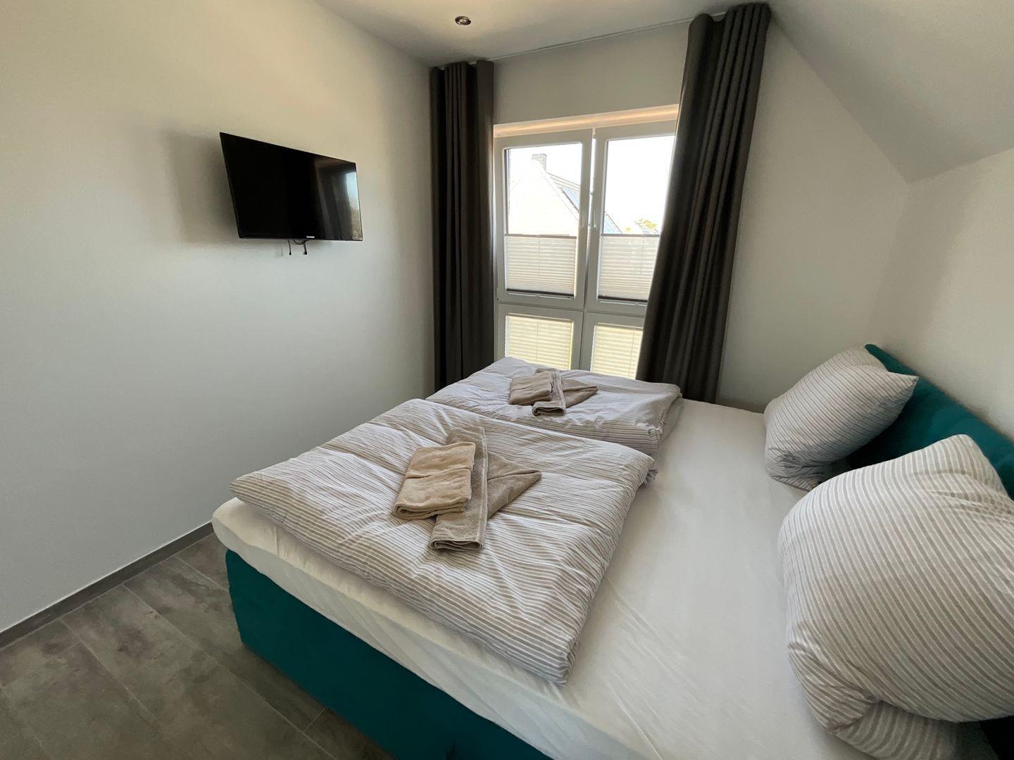 Schlafzimmer 2: Doppel-Boxspringbett (Maße: 200 x 200 cm, 1 Matratze), Nachttische, Kleiderschrank, Flachbildfernseher (Smart TV), Verdunkelungsvorhänge