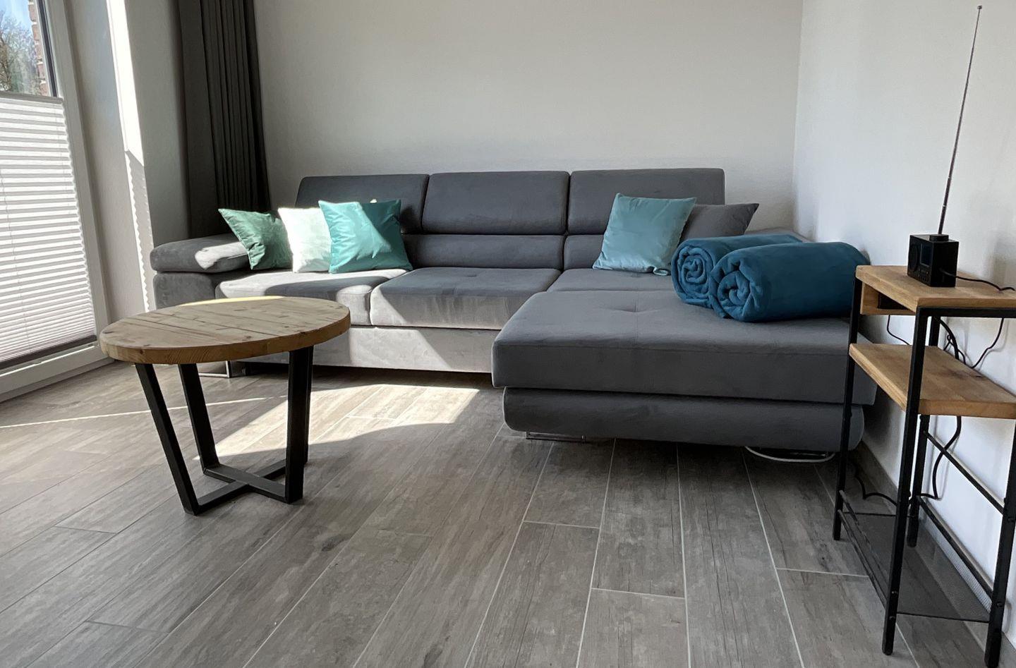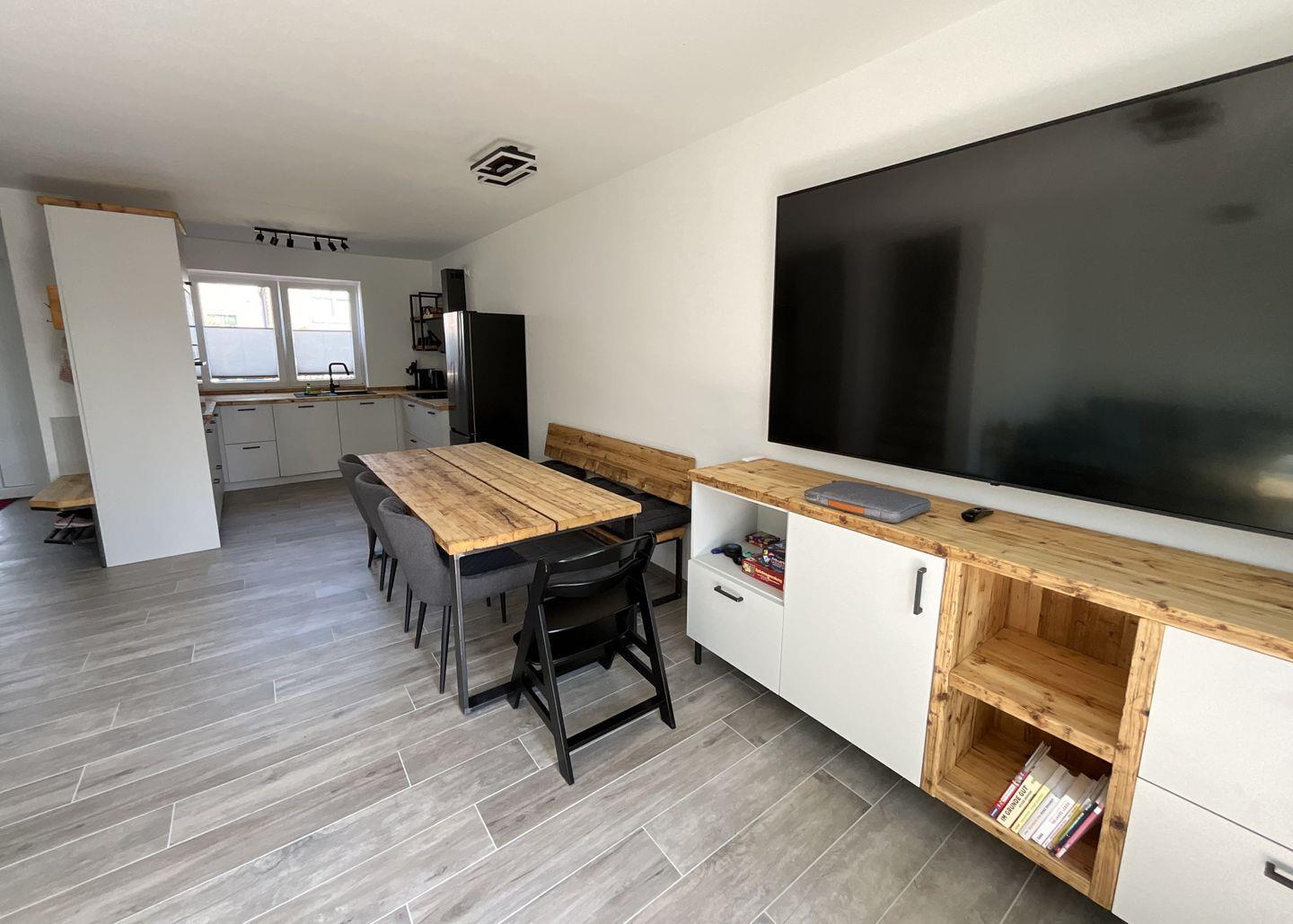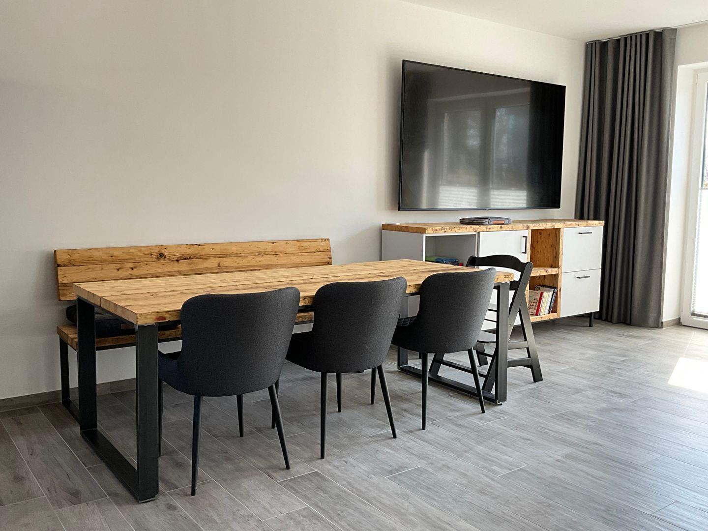 Wohn-Esszimmer: gemütliche Eckcouch, Flachbildfernseher (Smart TV), Empfang deutschsprachiger TV-Programme (SAT-Anlage), großer Esstisch mit 7 Sitzmöglichkeiten als Mittelpunkt im Erdgeschoss