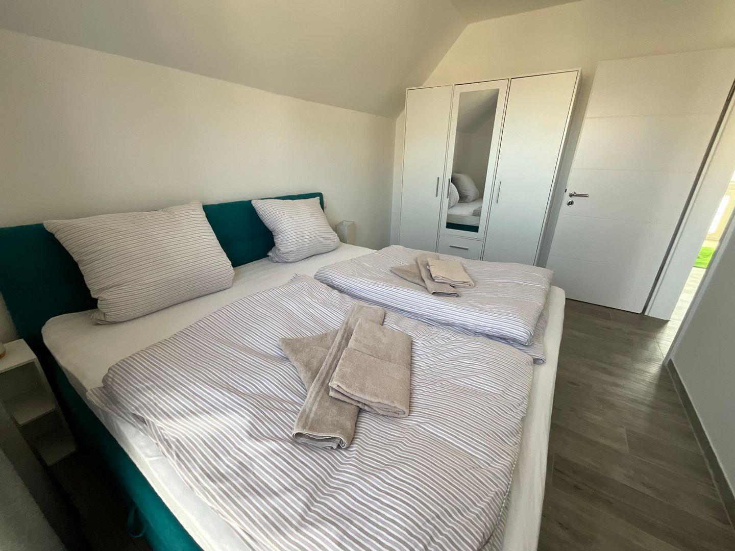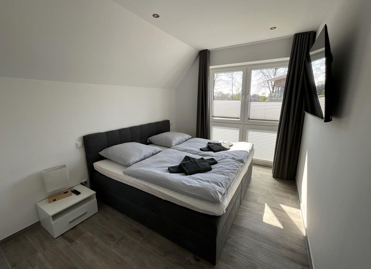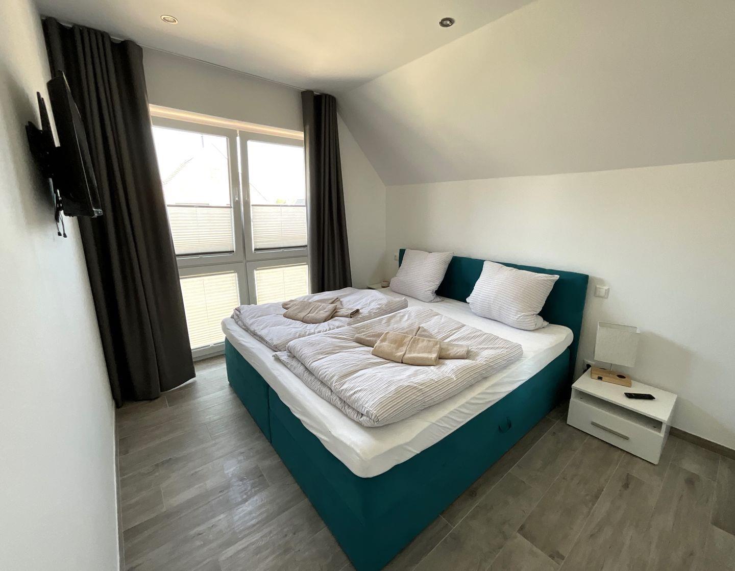 Schlafzimmer 1: Doppel-Boxspringbett (Maße: 200 x 200 cm, 1 Matratze), Nachttische, Kleiderschrank, Flachbildfernseher (Smart TV), Verdunkelungsvorhänge