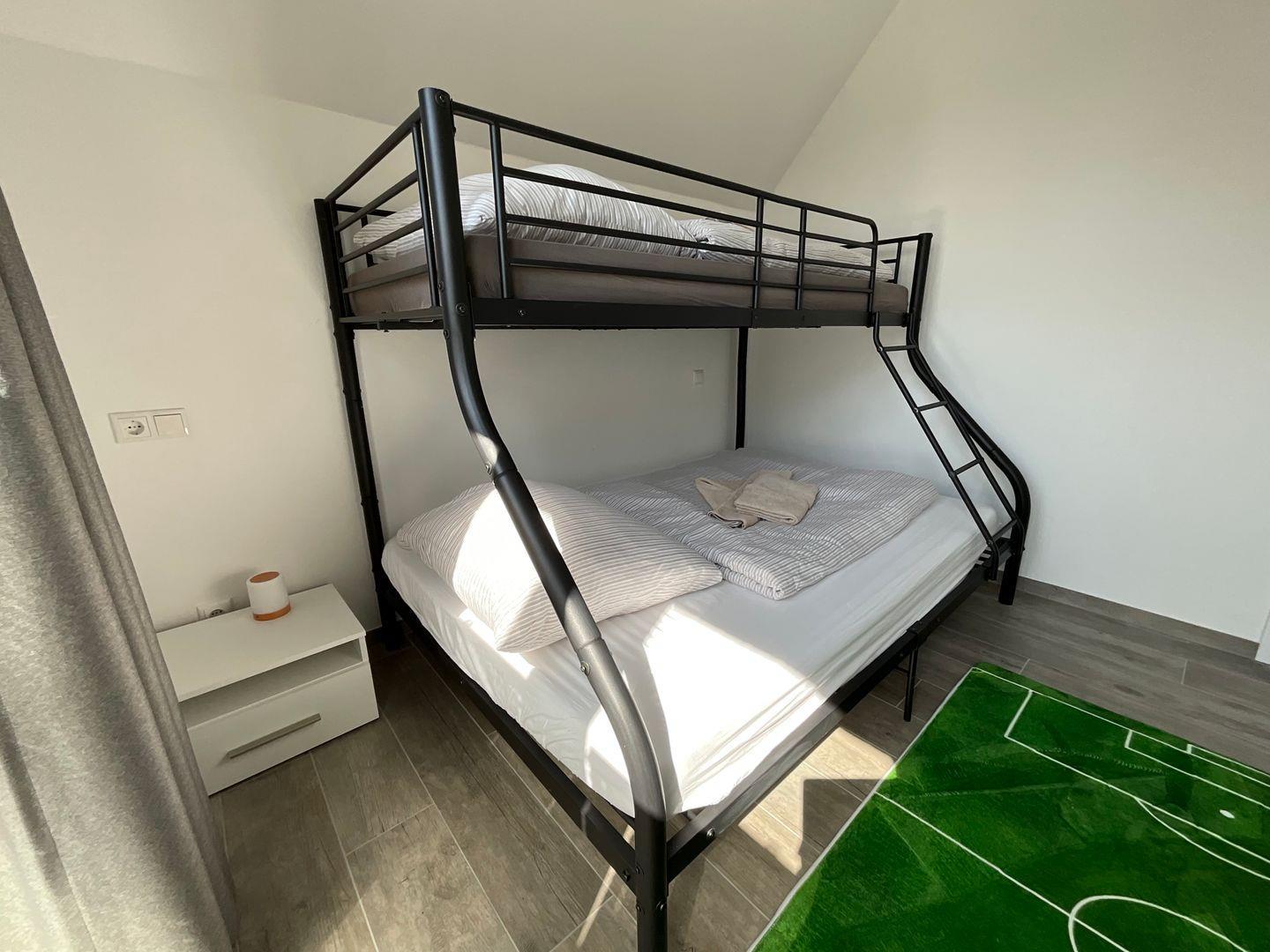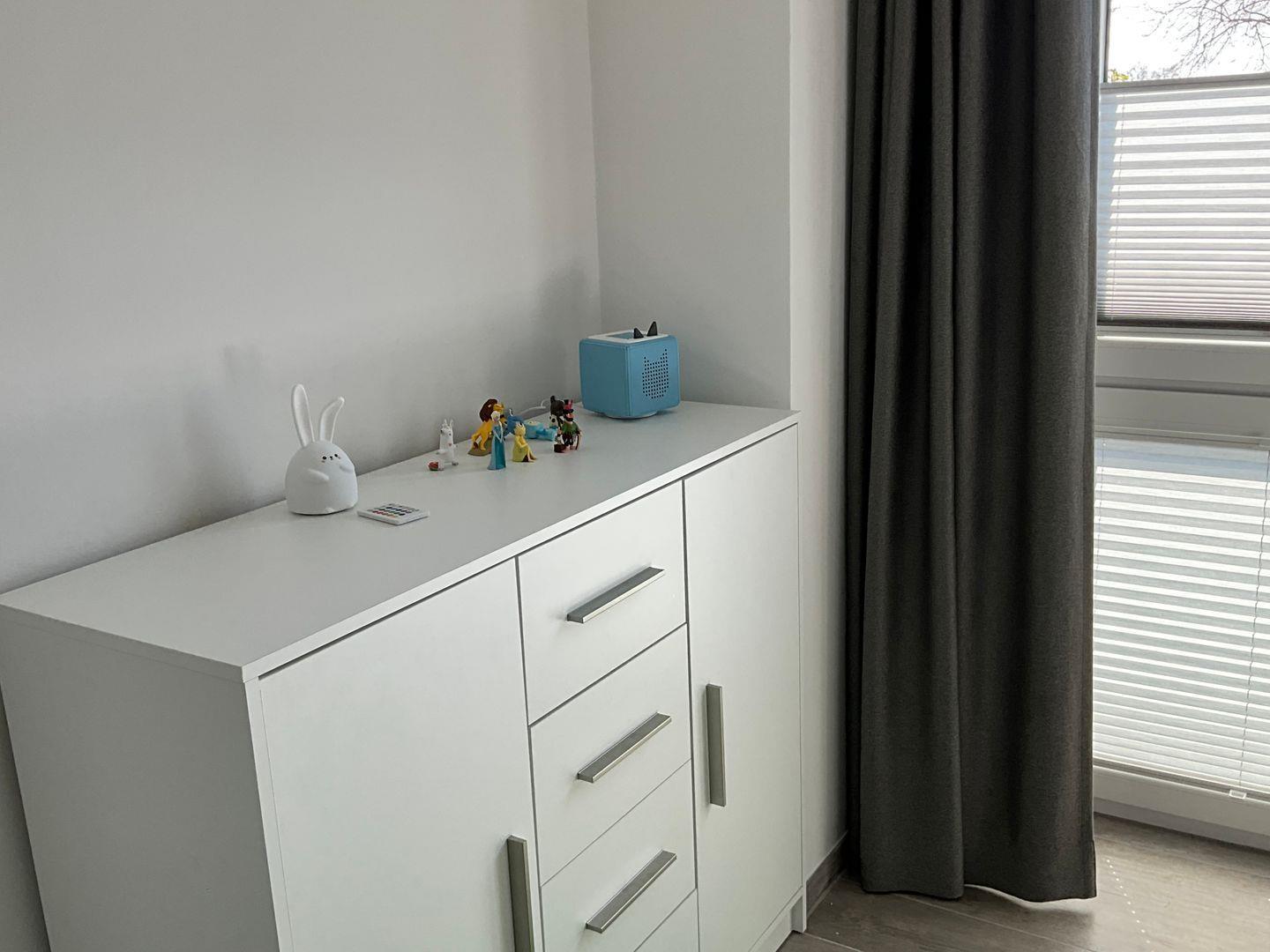 Schlafzimmer 3: extrabreites Etagenbett mit extrabreitem unteren Bett ( 2 Einzelmatratzen: 90x200 cm oben + 140x200cm unten), Kommode, Toniebox mit 8 Tonies, Verdunkelungsvorhänge