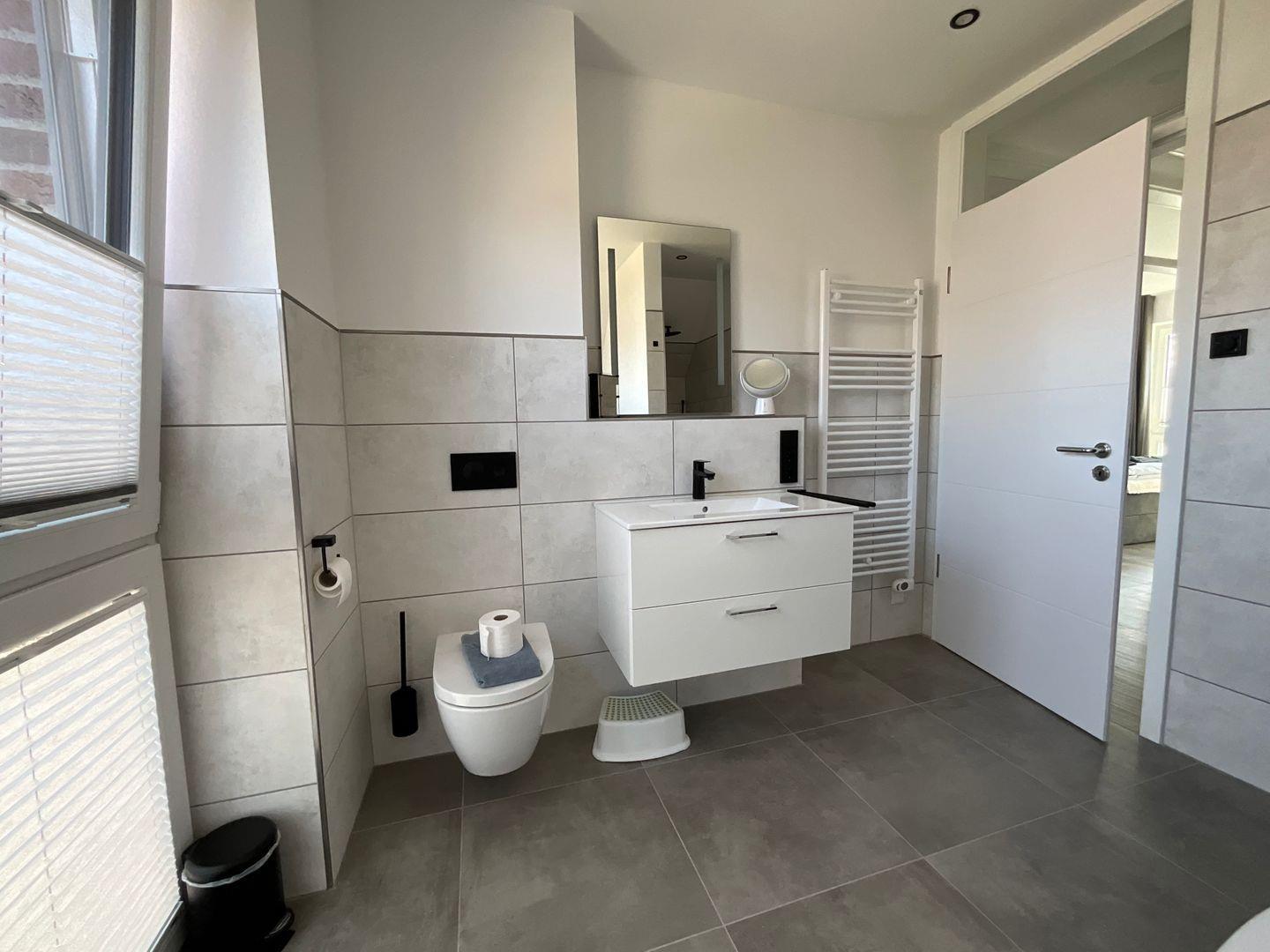 Bad und Sanitär im 1. OG: bodentiefe, barrierefreie Sommerregendusche, Badewanne, Waschtischanlage mit Spiegel, WC, Handtuchheizung, Föhn, Handtücher auf Anfrage