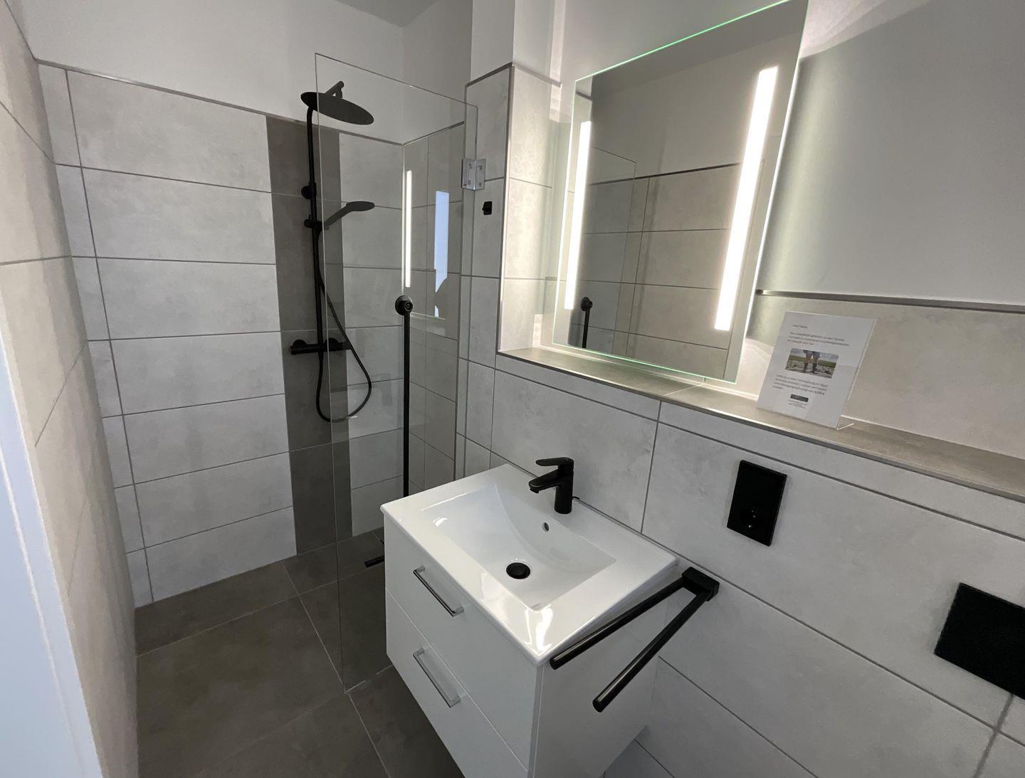 Duschbad im Erdgeschoss: bodentiefe, barrierefreie Sommerregendusche, Waschtischanlage mit Spiegel, WC