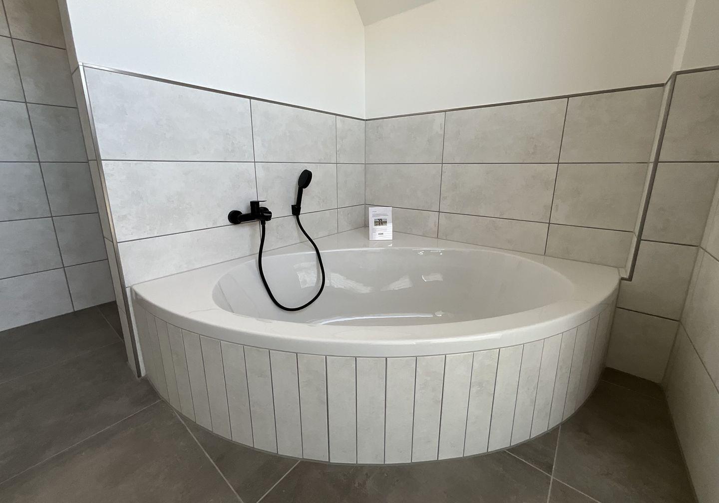 Im Wohnbereich finden Sie eine komfortable Sofaecke mit einem großen Fernseher, der für Unterhaltung sorgt. Die gemütliche Atmosphäre wird durch den modernen Fliesenboden ergänzt. Ein weiteres Highlight des Hauses ist die bodengleiche Dusche sowie eine Badewanne, die zusätzlichen Komfort bietet. Jedes Badezimmer ist mit einer Dusche ausgestattet, sodass sich die Gäste bequem vorbereiten können.