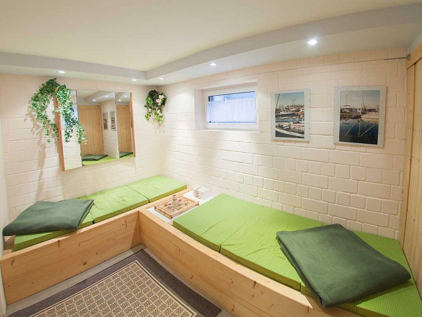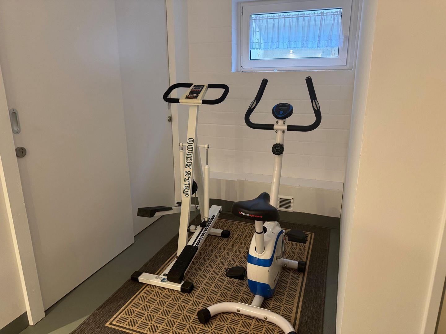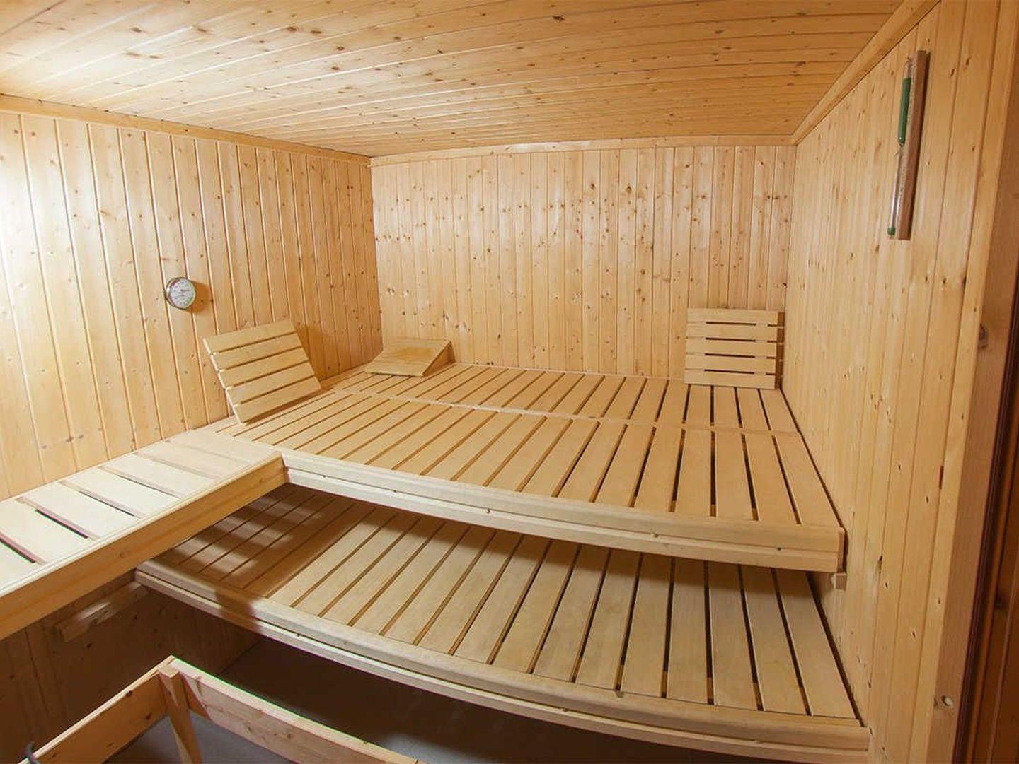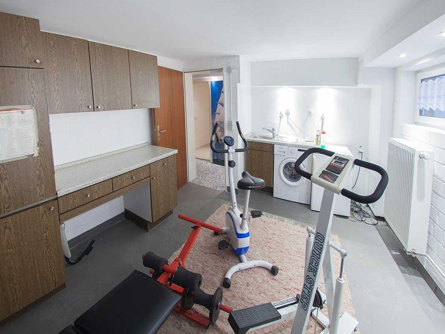 Im Untergeschoß befindet sich die große Sauna mit Dusche und Ruheraum, sowie ein Fitnessbereich.