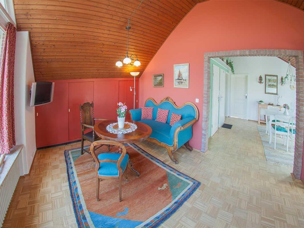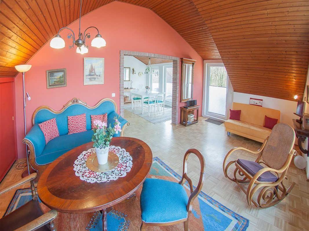 Die Ferienwohnung befindet sich im ersten Stock und ist vollständig ausgestattet, um sicherzustellen, dass Sie sich sofort wie zu Hause fühlen. Der Wohnbereich, mit Parkettboden ausgestattet, ist freundlich und hell gestaltet und lädt zum Verweilen ein. Hier finden Sie eine gemütliche Sofaecke, die ideal zum Entspannen nach einem erlebnisreichen Tag ist. Der Essbereich verfügt über einen großen Esstisch, an dem Sie zusammensitzen und gemeinsame Mahlzeiten genießen können. Für Ihre Unterhaltung sorgt ein TV-Gerät sowie ein Radio. Kostenloses WLAN ist ebenfalls verfügbar, sodass Sie im Kontakt mit Freunden und Familie bleiben können.