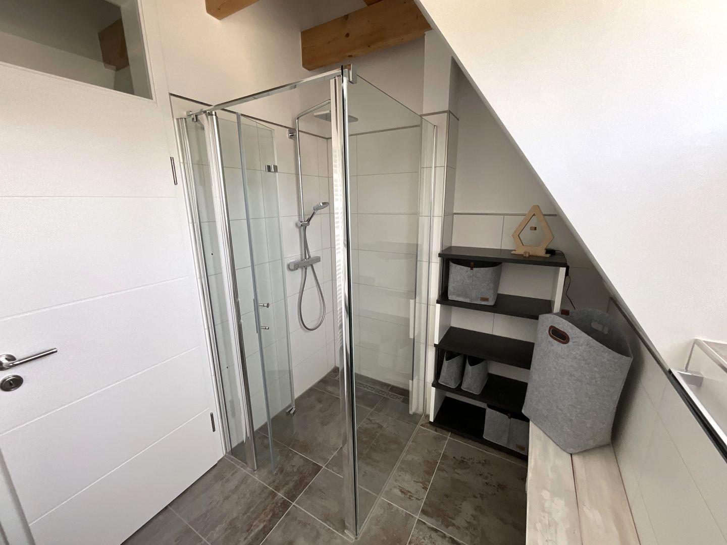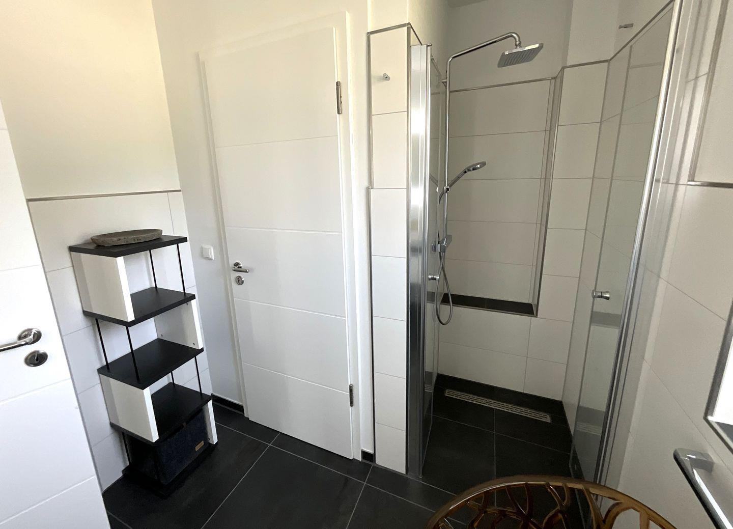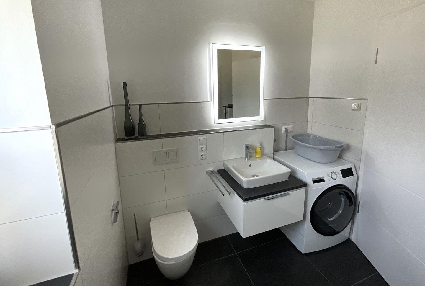 Bad und Sanitär: 2 bodentiefe, barrierefreie Sommerregenduschen, Waschtischanlage mit Spiegel, WC, Föhn, Waschmaschine,
