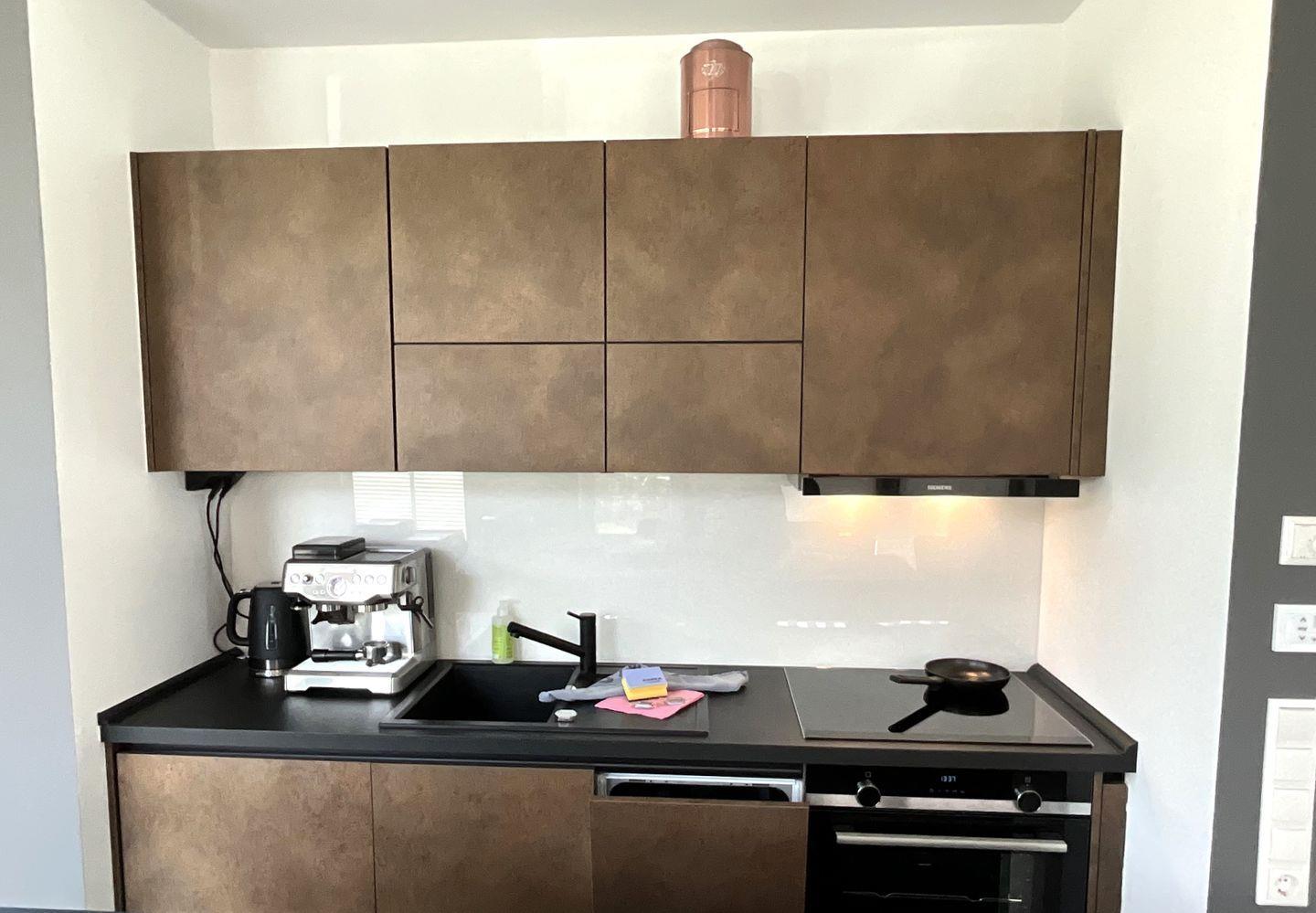Küche und Haushalt: Einbauküche, Kühlschrank mit Gefrierfach, 4-Zonen Cerankochfeld, Backofen, Dunstabzugshaube, Geschirrspüler, Espressomaschine, Wasserkocher, hochwertiges Geschirr und Besteck