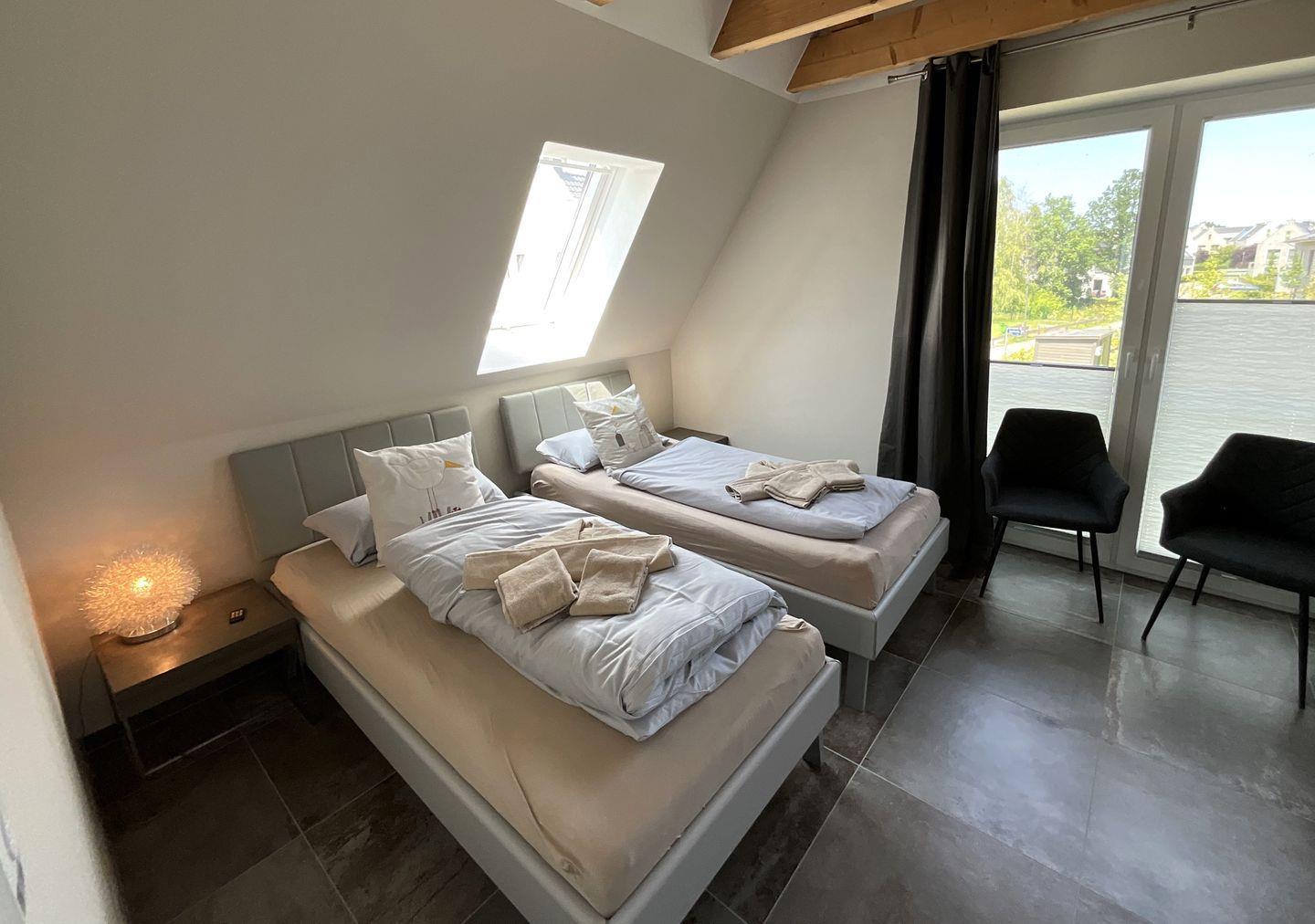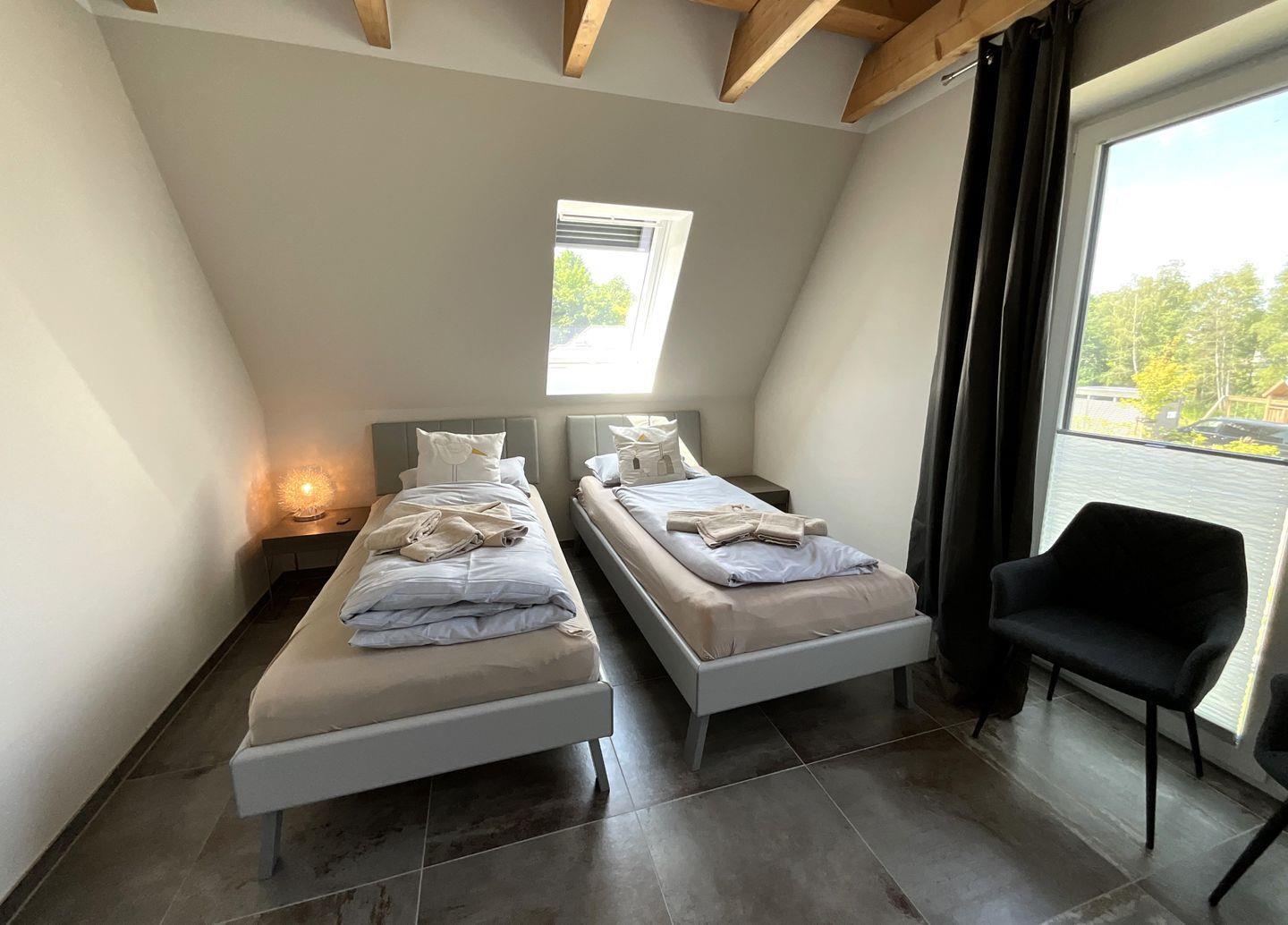 Das Ferienhaus verfügt über zwei Schlafzimmer mit insgesamt vier Schlafmöglichkeiten. Beide Schlafzimmer sind mit Fliesenboden ausgelegt und allergikerfreundlich gestaltet. Neben einer Garderobe und Kommoden sind die Räumlichkeiten so eingerichtet, dass Sie ausreichend Stauraum und Komfort vorfinden. Für Arbeit oder Studienzwecke steht zudem ein Schreibtisch bereit. Zwei Badezimmer sind vorhanden, jeweils mit bodengleicher Dusche, WC, Waschbecken, Spiegel, warmem Wasser und modernen Sanitäreinrichtungen. Waschmaschine und Bügeleisen stehen zur Eigennutzung zur Verfügung, ebenso Wäscheständer und ein Haartrockner.