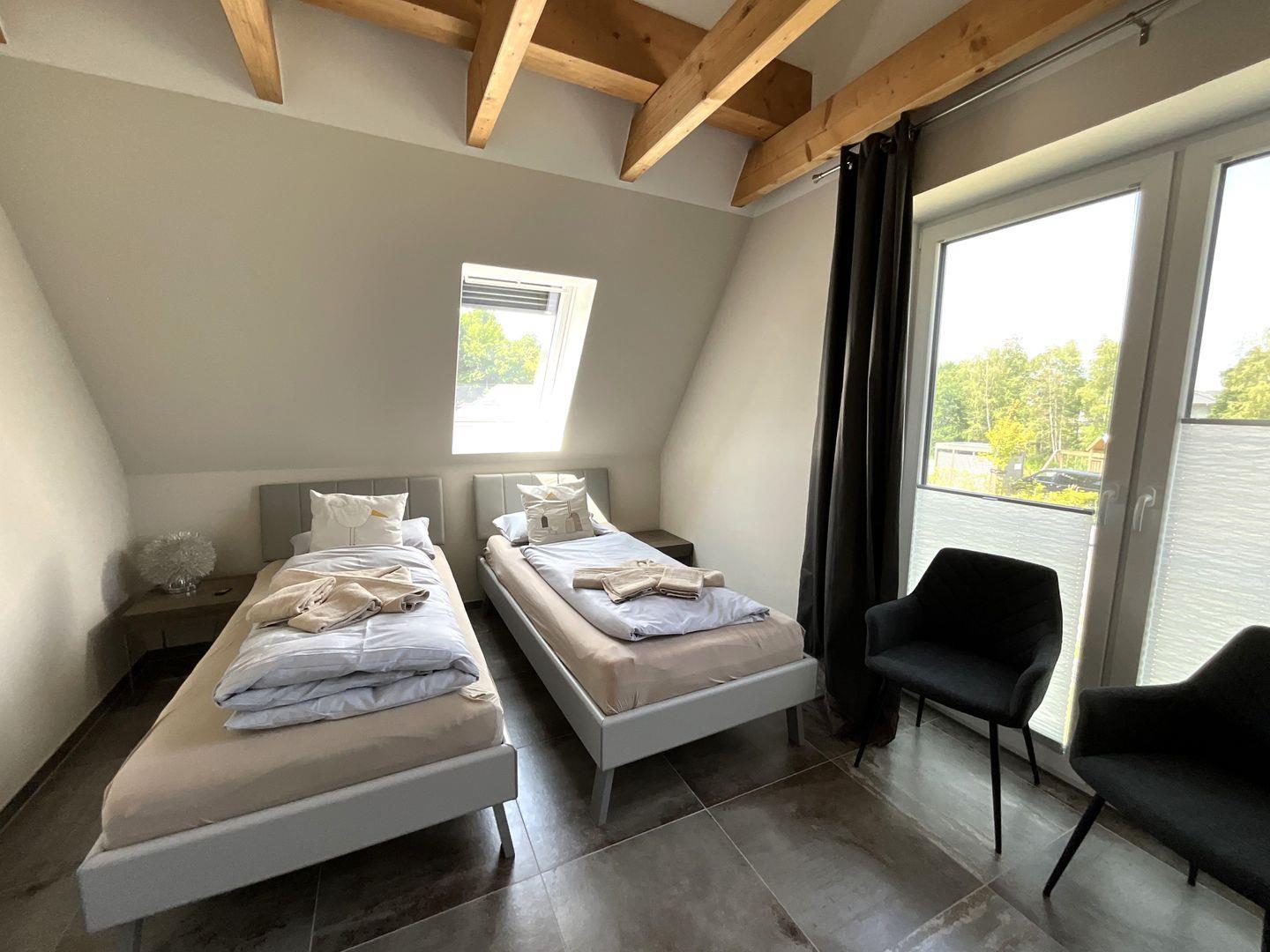 Schlafzimmer 1: 2 Einzelbetten (2 Einzelmatratzen je 90x200cm), Nachttische, Leselampen, Kleiderständer, Musikanlage