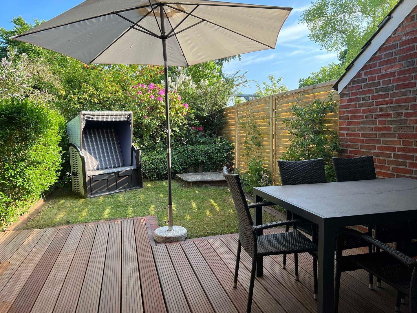 Besonderes Augenmerk wurde auf die Gestaltung des Außenbereichs gelegt. Die überdachte Terrasse lädt mit Gartenmöbeln, Sonnenliegen und einem Strandkorb zum Verweilen ein. Ein Sonnenschutz sorgt an sonnigen Tagen für angenehme Temperaturen, während der eigene Garten mit Liegewiese, Windschutz und eingezäuntem Grundstück auch den Bedürfnissen von Kindern besonders gerecht wird. Das Grundstück ist kindersicher umzäunt. Das Gartenhaus bietet zusätzlichen Stauraum für Ihre Fahrräder oder Freizeitutensilien. Ein Bollerwagen ist ebenfalls vorhanden.