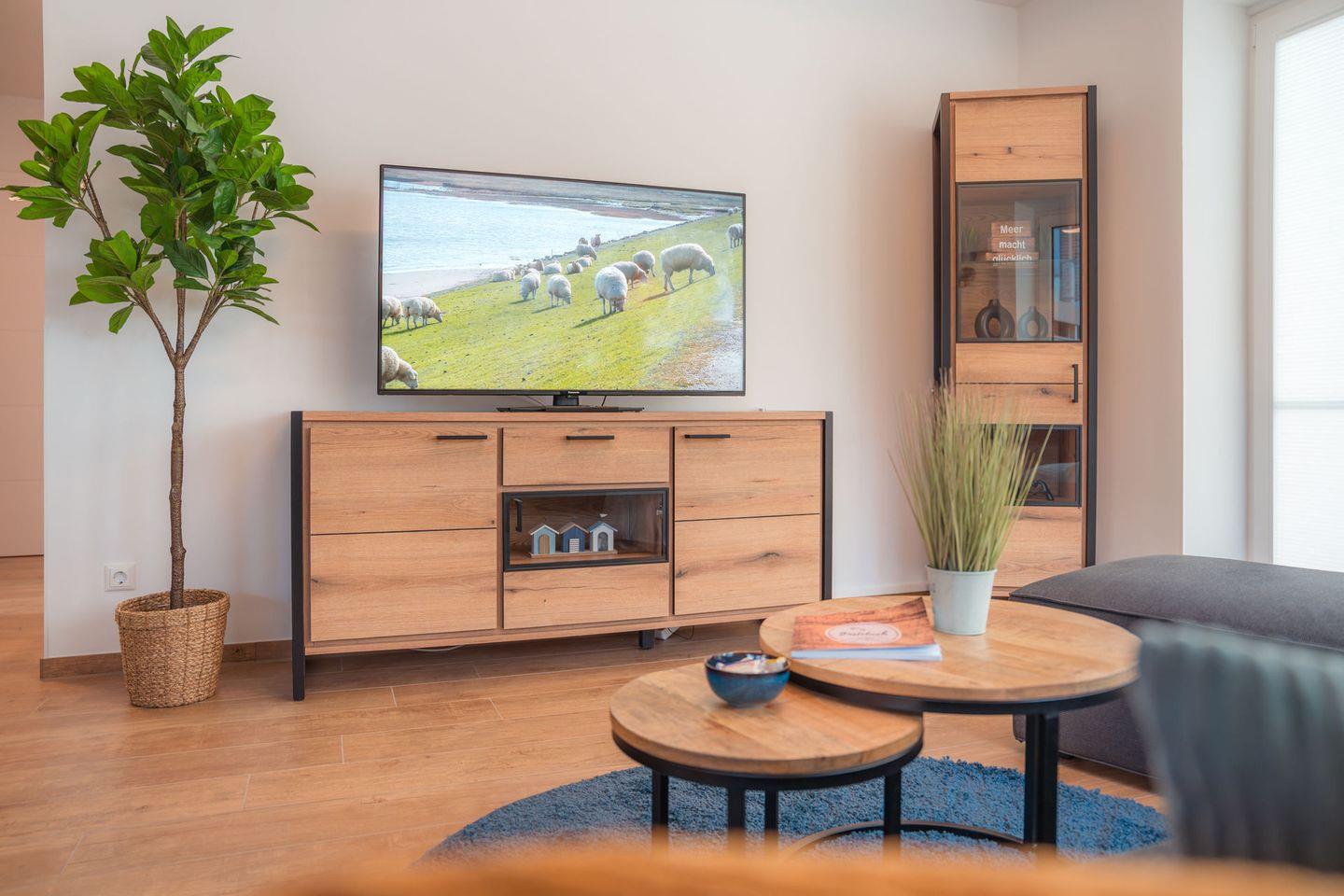Das Watt'n Wunder verfügt über drei Zimmer, darunter zwei separate Schlafzimmer mit insgesamt vier Schlafmöglichkeiten. Der Bodenbelag aus Fliesen in Wohn- und Schlafzimmern – inkl. Fliegengittern an den Fenstern und Sichtschutz für alle Fenster – gewährleisten ein angenehmes Raumklima und bieten ideale Bedingungen für Allergiker. Die Grundausstattung schließt einen Wohnbereich mit Sofaecke, Essbereich und moderner offener Küche ein, deren Ausstattung auch für anspruchsvolles Kochen bestens geeignet ist: Zur Verfügung stehen Ihnen ein Ceranherd mit Elektrobackofen, Kühlschrank mit Gefrierfach, Spülmaschine, Wasserkocher, Toaster, Kaffeemaschine sowie umfangreiches Geschirr, Besteck und Küchenutensilien. Das Tageslicht-Bad ist mit bodengleicher Dusche, hochwertigem Waschbecken, Spiegel ausgestattet.