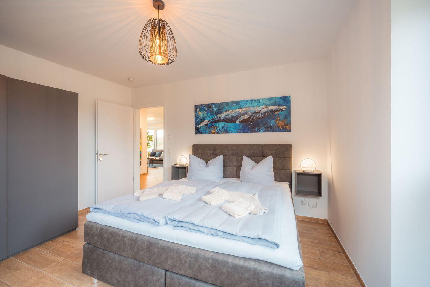 Schlafzimmer 2: Doppelbett (Maße: 180 x 200 cm- durchgängige Matratze), Nachttische, Leselampen, Kleiderschrank, Smart-TV, verdunkelnde Plissees