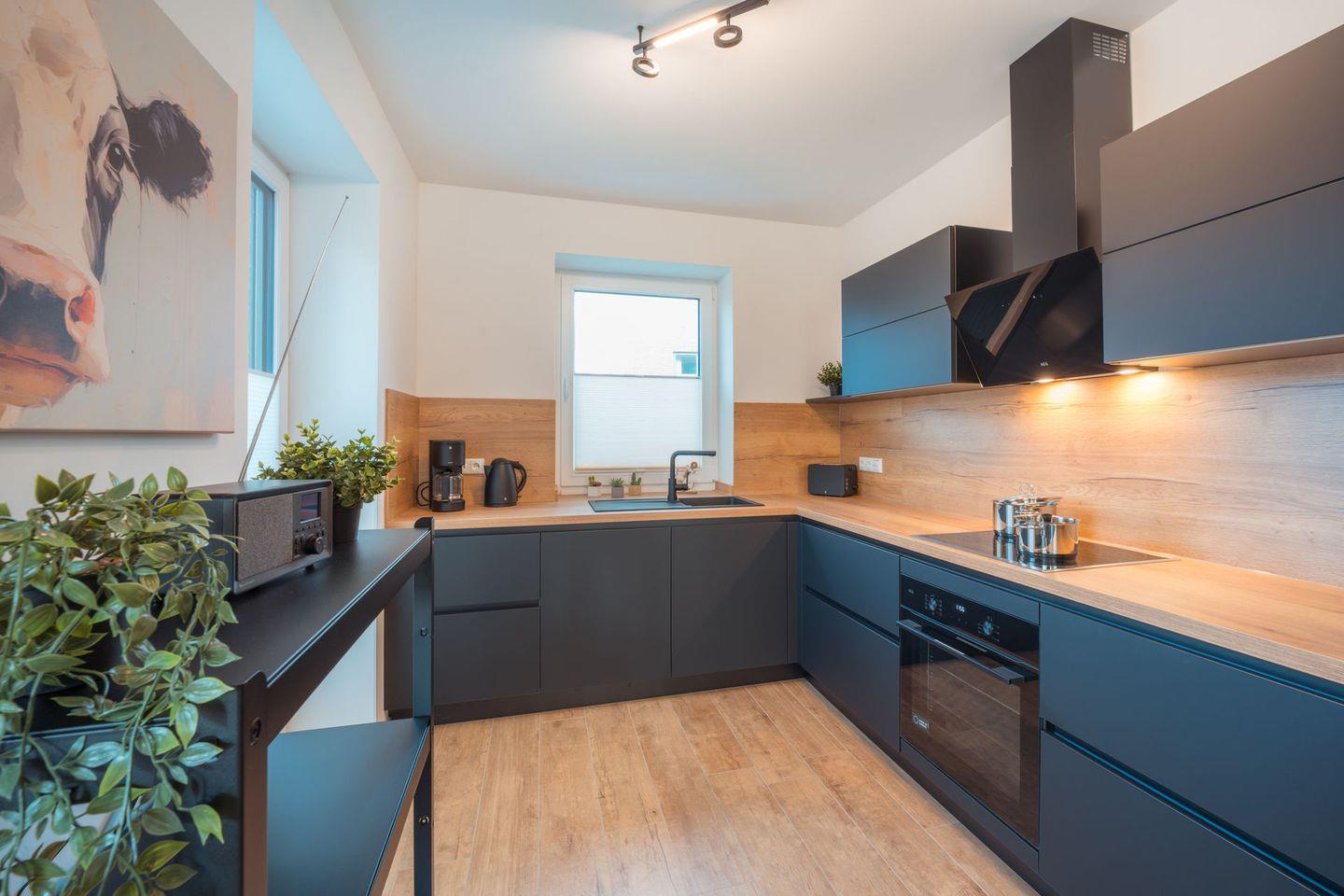 Küche und Haushalt: Einbauküche, Kühlschrank mit Gefrierfach, Ceranherd, Dunstabzugshaube, Backofen, Geschirrspüler, Wasserkocher, hochwertiges Geschirr und Besteck, diverse Küchenutensilien