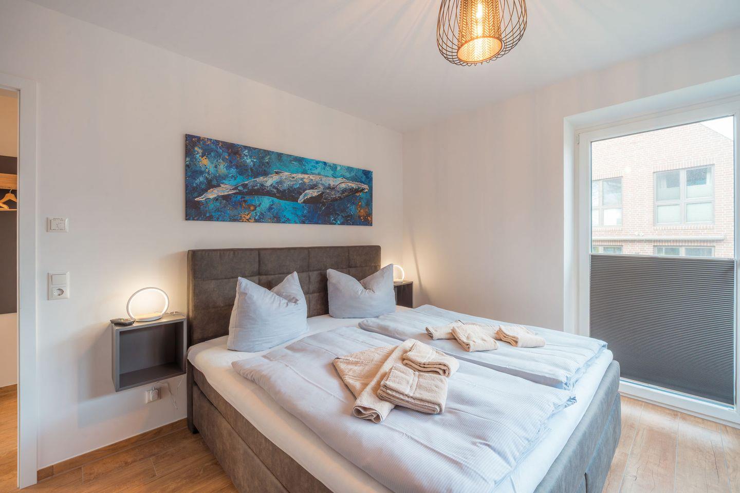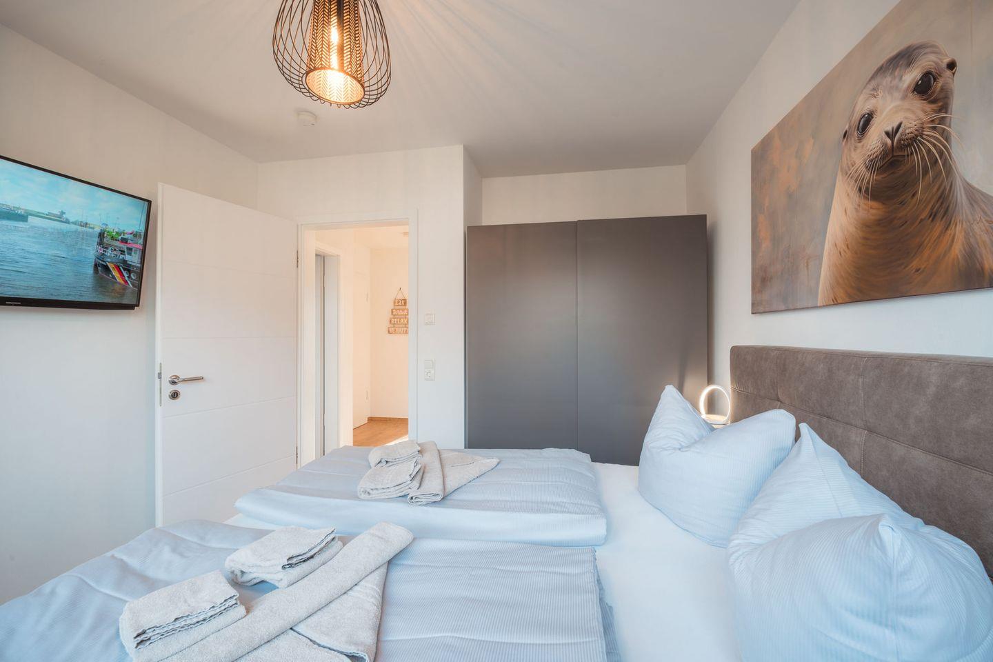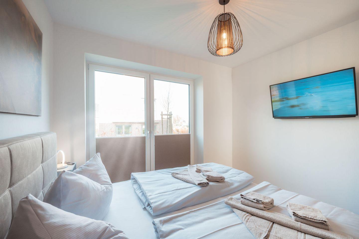 Schlafzimmer 1: Doppelbett (Maße: 180 x 200 cm- durchgängige Matratze), Nachttische, Leselampen, Kleiderschrank, Smart-TV, verdunkelnde Plissees