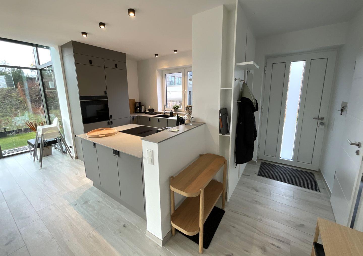 Küche und Haushalt: Einbauküche, Kühlschrank mit Gefrierfach, 4-Zonen Cerankochfeld mit integriertem Dunstabzug, Backofen, Geschirrspüler, Kaffeefiltermaschine, Nespresso Espressomaschine, Toaster, Wasserkocher, hochwertiges Geschirr und Besteck.