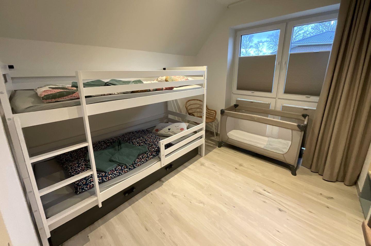 Schlafzimmer 3: Etagenbett (2 Einzelmatratzen 90x200 cm), Kommode, Verdunkelungsvorhänge