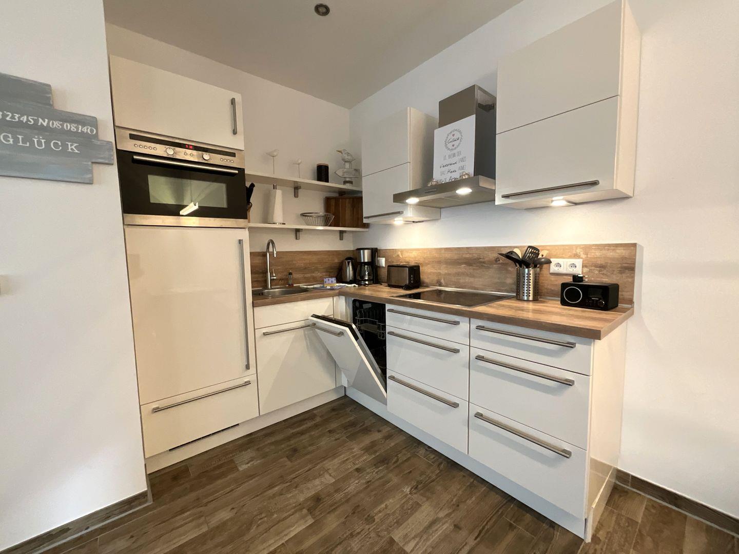 Küche: Backofen, 4-Zonen Cerankochfeld, Kühlschrank mit Gefrierfach, Dunstabzugshaube, Geschirrspüler, Toaster, Wasserkocher, Kaffeefiltermaschine, Geschirr, Esstisch mit 4 Stühlen, Radio