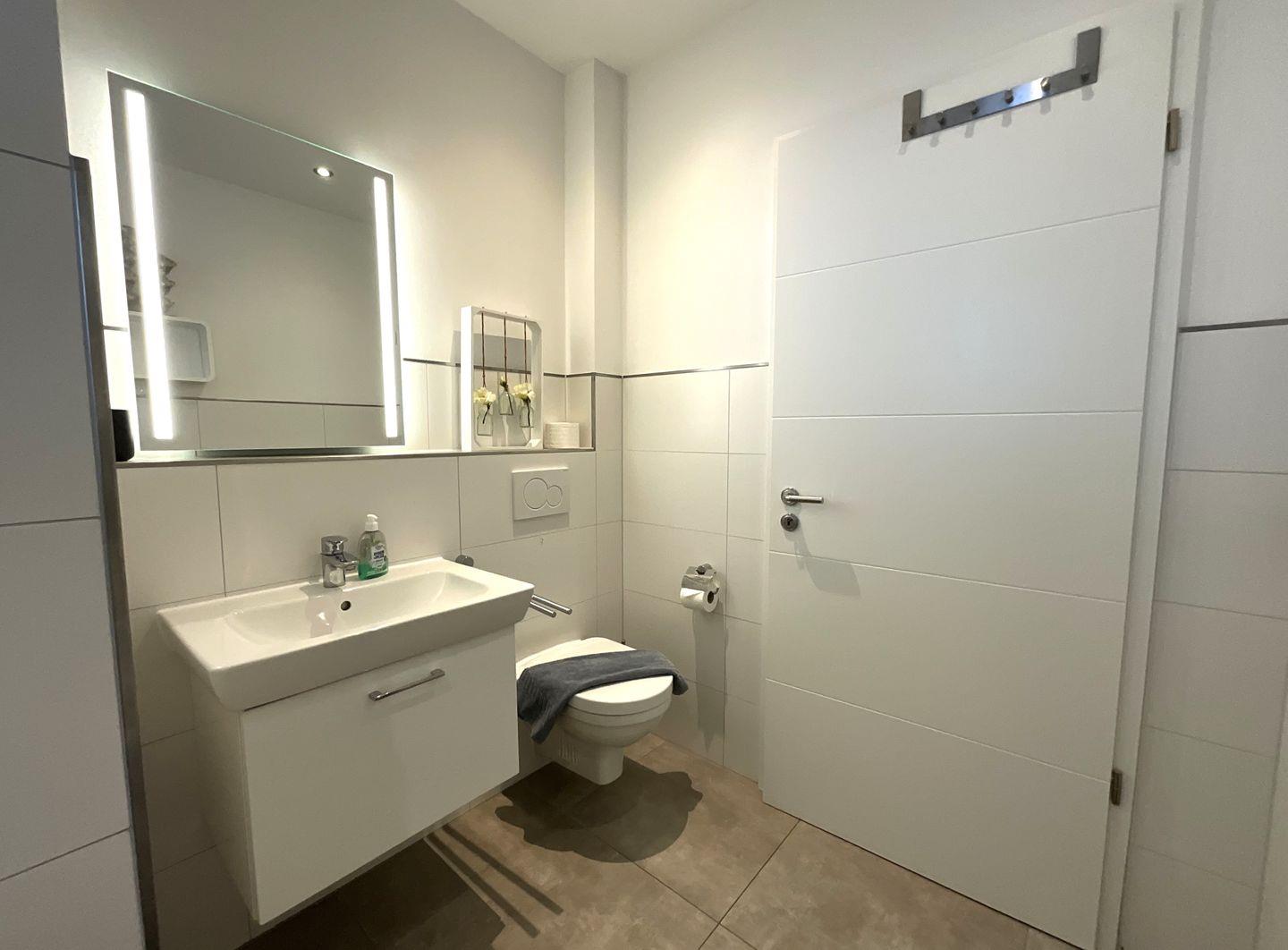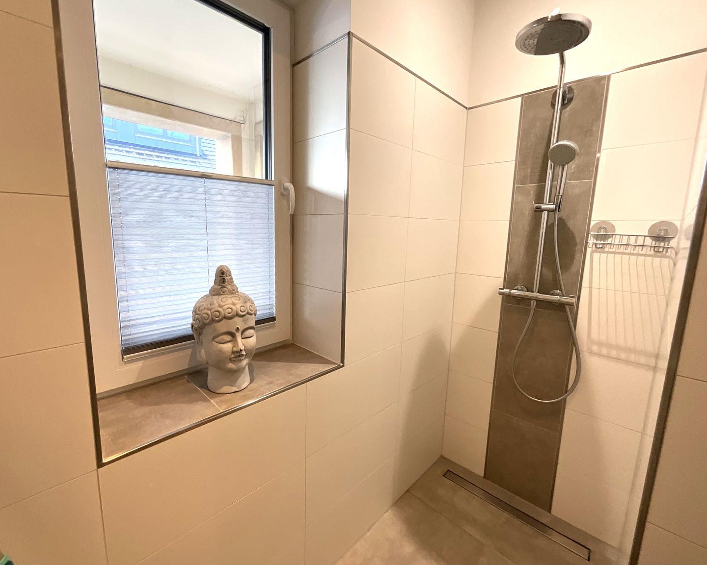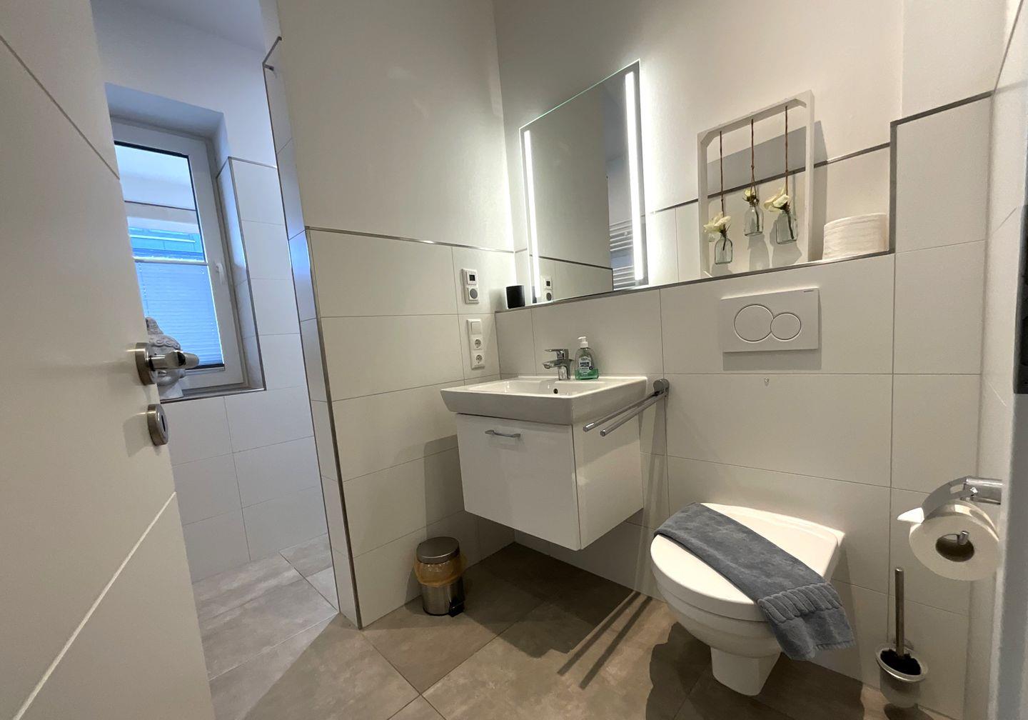 Das Tageslicht-Badezimmer ist modern gestaltet und mit einer bodengleichen Dusche, Waschtisch, WC, Spiegel, Haartrockner ausgestattet.