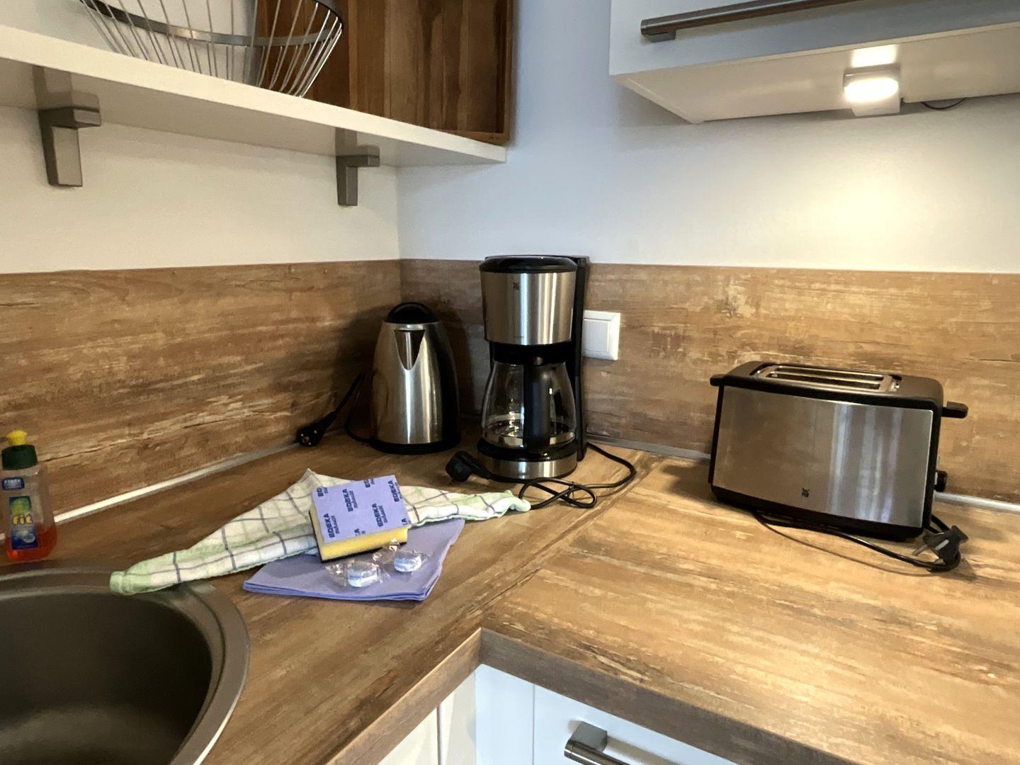 Die moderne offene Küche ist bestens ausgestattet: Ceranherd, Backofen, Mikrowelle, Spülmaschine, Kühlschrank mit Gefrierfach, Kaffeemaschine, Toaster und Wasserkocher sowie umfangreiches Geschirr und Küchenutensilien stehen Ihnen zur Verfügung. Familien profitieren von einem Hochstuhl und einem Babybett. Auch an praktische Details wurde gedacht: Waschmaschine zur Eigennutzung, Bügelbrett, Bügeleisen, Wäscheständer und Staubsauger sind vorhanden.