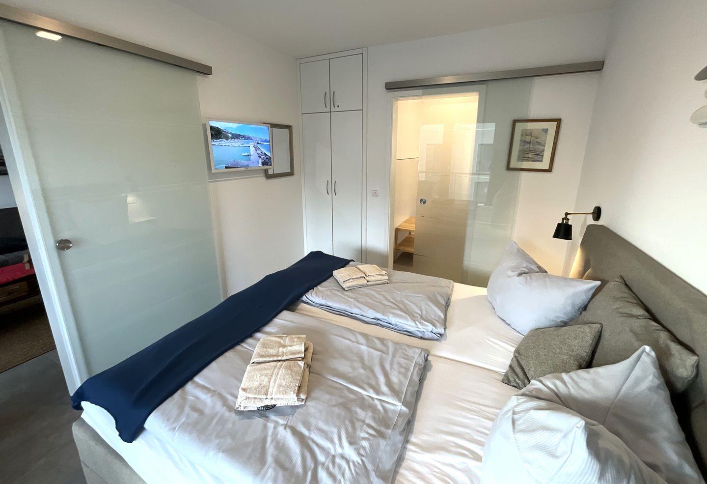 Schlafzimmer: Doppelbett (Maße: 180 x 200 cm-durchgängige Matratze), Nachttische, Leselampen, Kleiderschrank, Fernseher