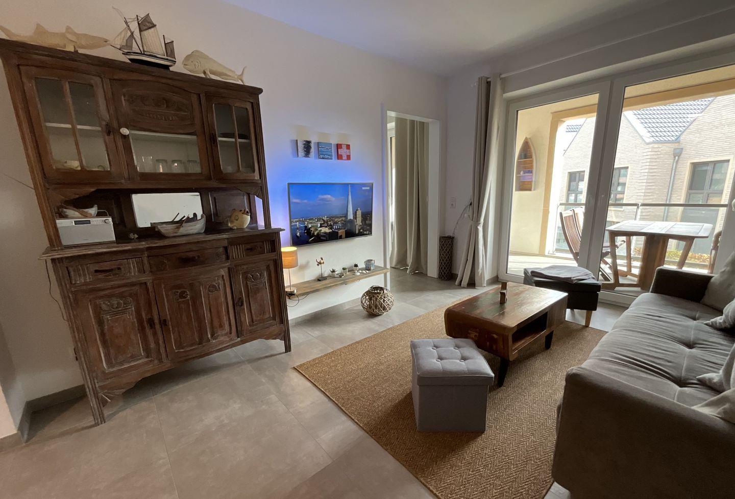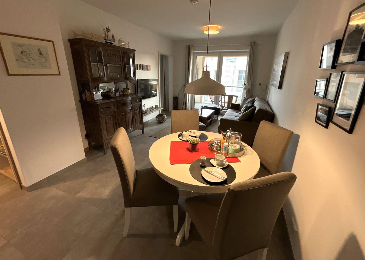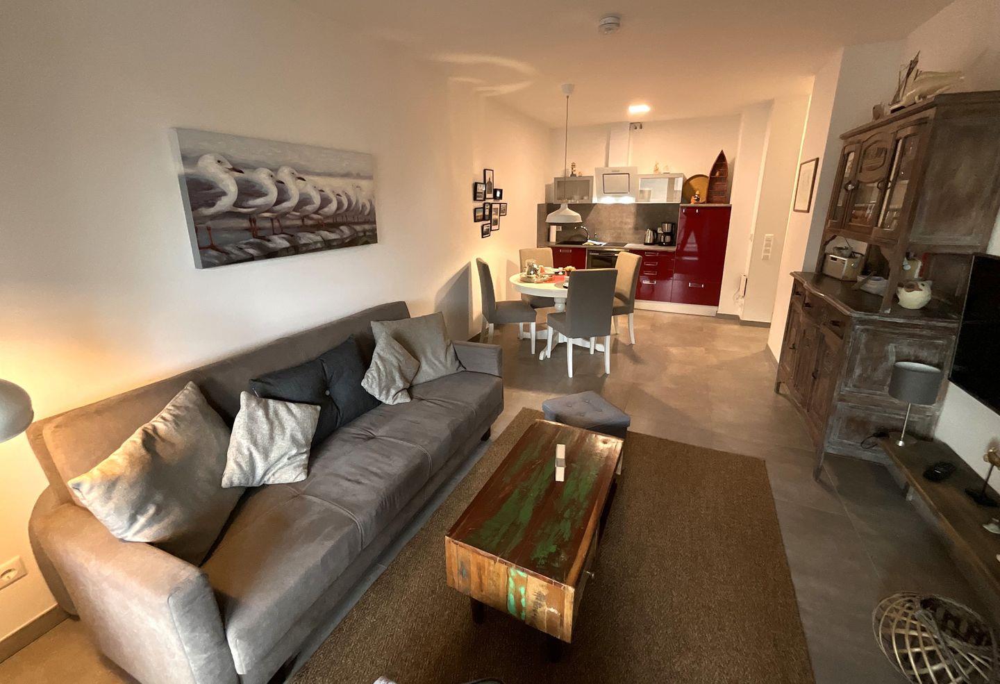 Das Apartment selbst überzeugt durch einen offenen, modernen Schnitt. Der helle Wohnbereich ist mit Fliesenböden, Fußbodenheizung und einer gemütlichen Sofaecke ausgestattet. Ein TV, CD-Spieler, Radio sowie kostenloses WLAN sorgen für Unterhaltung und Konnektivität. Der direkt angrenzende Essbereich bietet einen einladenden Esstisch. Die offene Küche ist umfassend ausgestattet: Sie verfügen über einen Ceranherd, Backofen, Spülmaschine, Kühlschrank mit Gefrierfach, Toaster, Kaffeemaschine, umfangreiche Küchenutensilien sowie Geschirr und Besteck. Damit steht einer komfortablen Selbstverpflegung nichts im Wege.