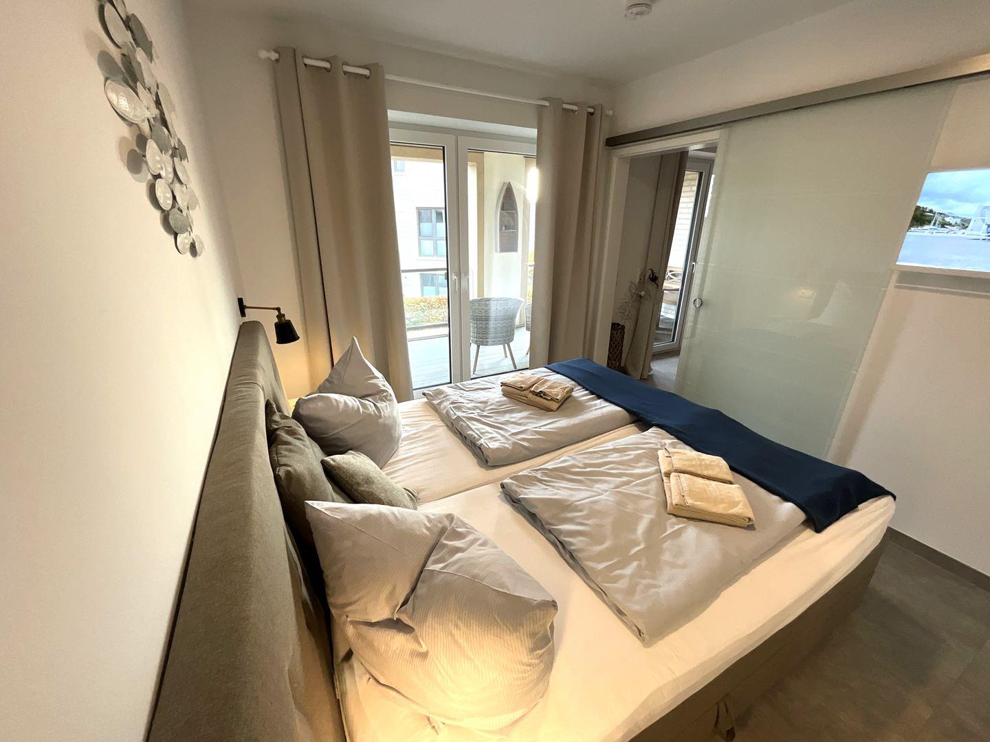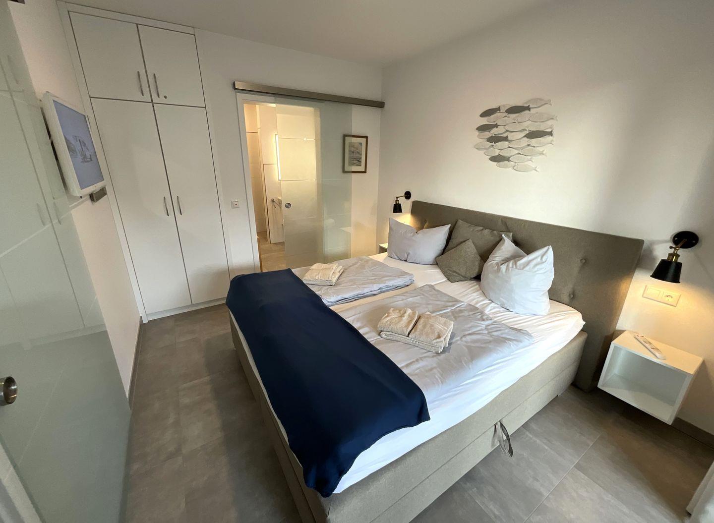 Dem separaten Schlafzimmer mit komfortablen Boxspringbett (1 Matratze 180 x 200 cm), schließt sich das modern gestaltete Badezimmer mit bodengleicher Dusche an