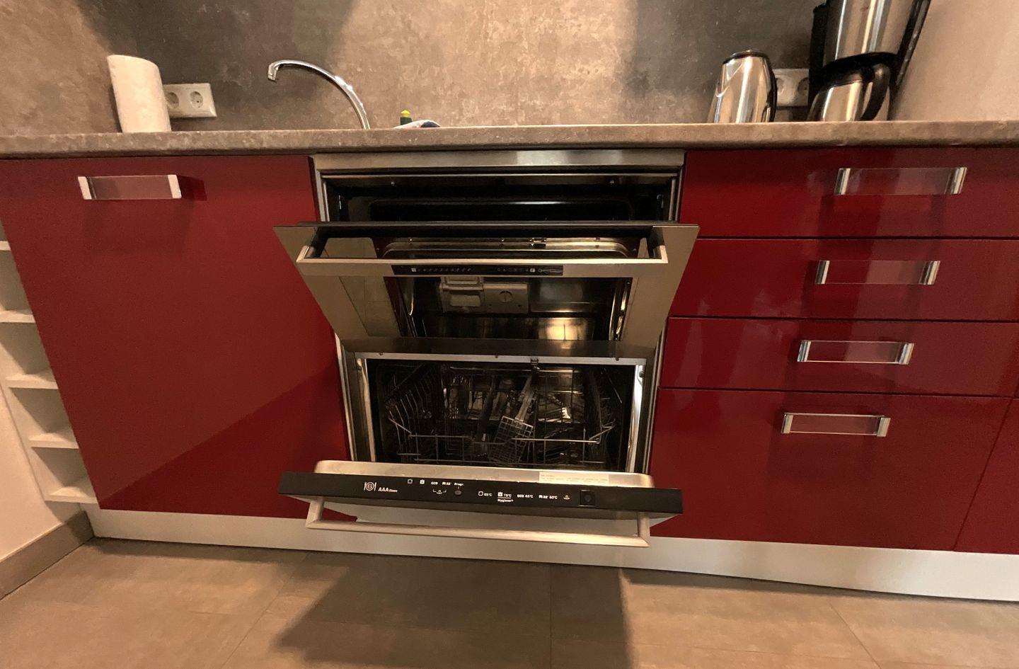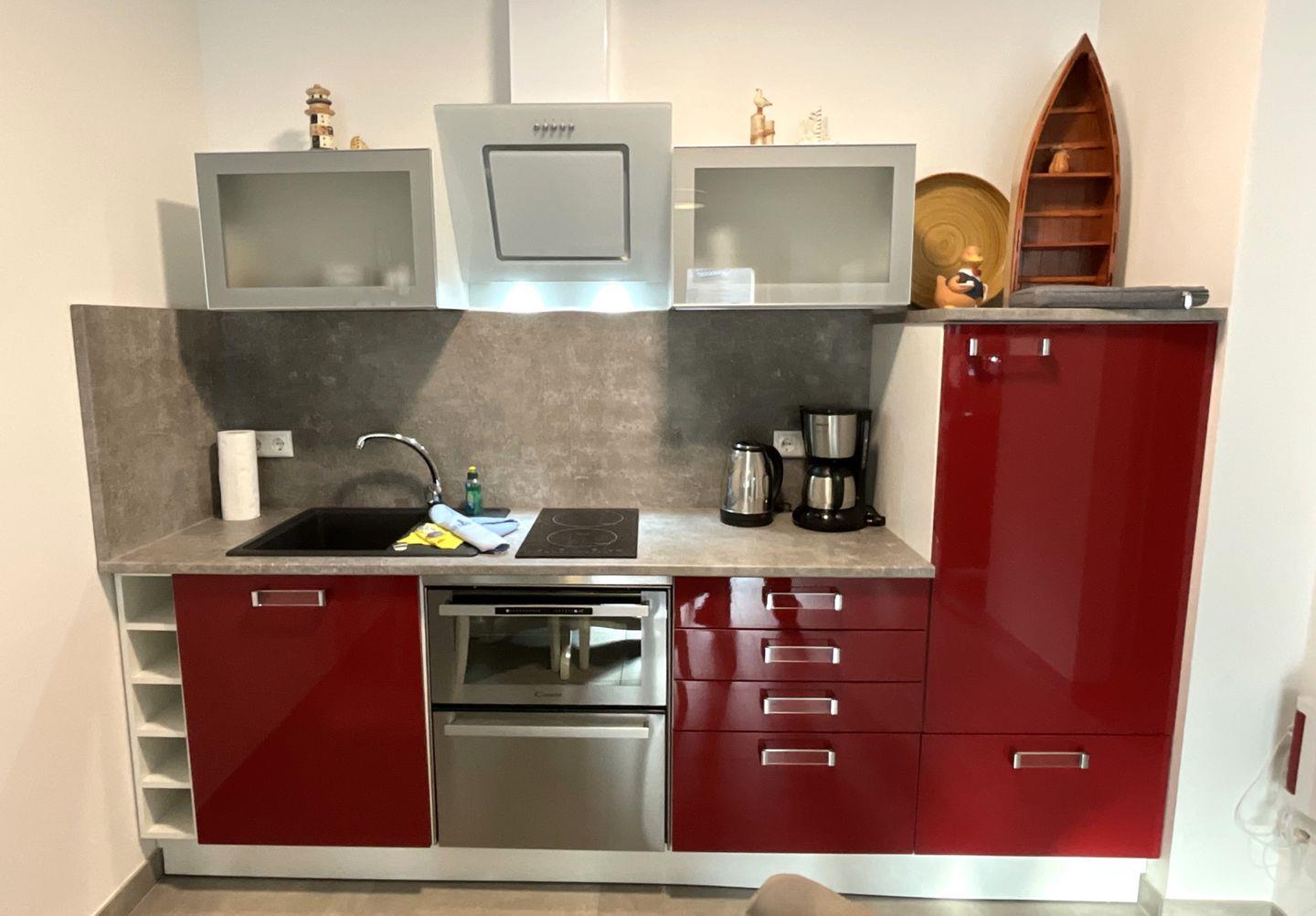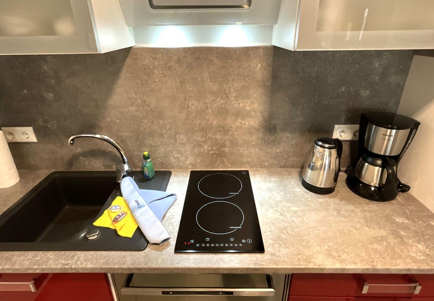 Küche und Haushalt: Einbauküche, Kühlschrank mit Gefrierfach, 2-Platten Induktionskochfeld, Backofen, Geschirrspüler, Kaffeefiltermaschine, Toaster, Wasserkocher, Eierkocher, hochwertiges Geschirr und Besteck, Esstisch mit 4 Stühlen